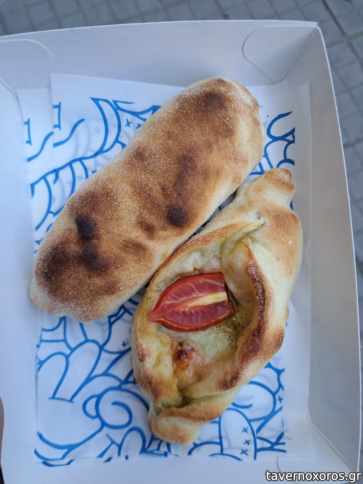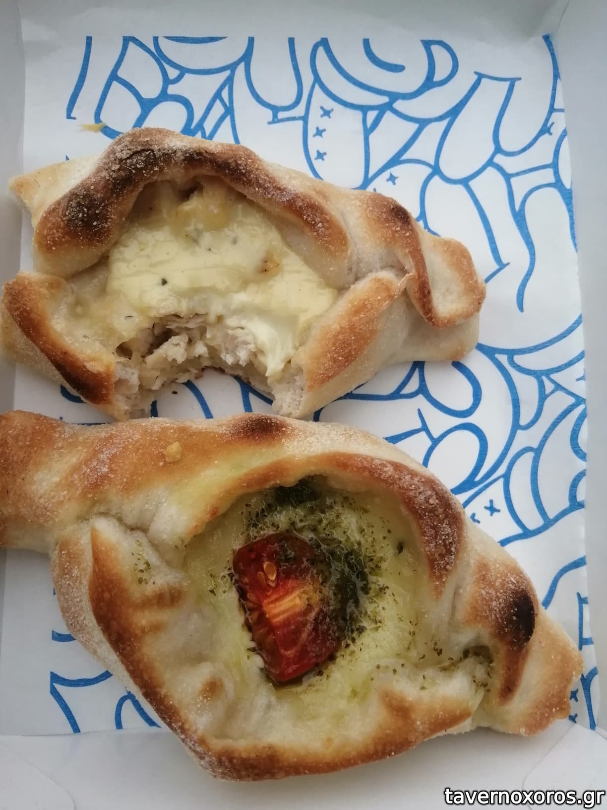 Πήρα ένα πεϊνιρλί με πέστο, μοτσαρέλα και ντοματίνια και μια ζύμη γεμιστή με λουκάνικο, τυρί και σάλτσα ντομάτας.