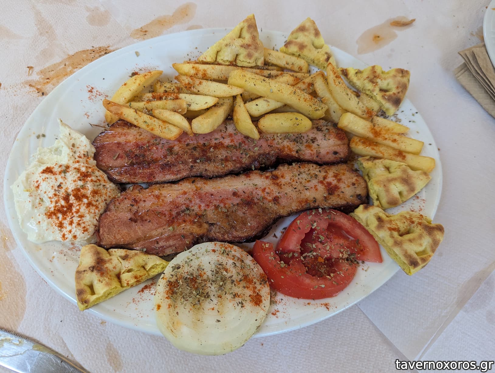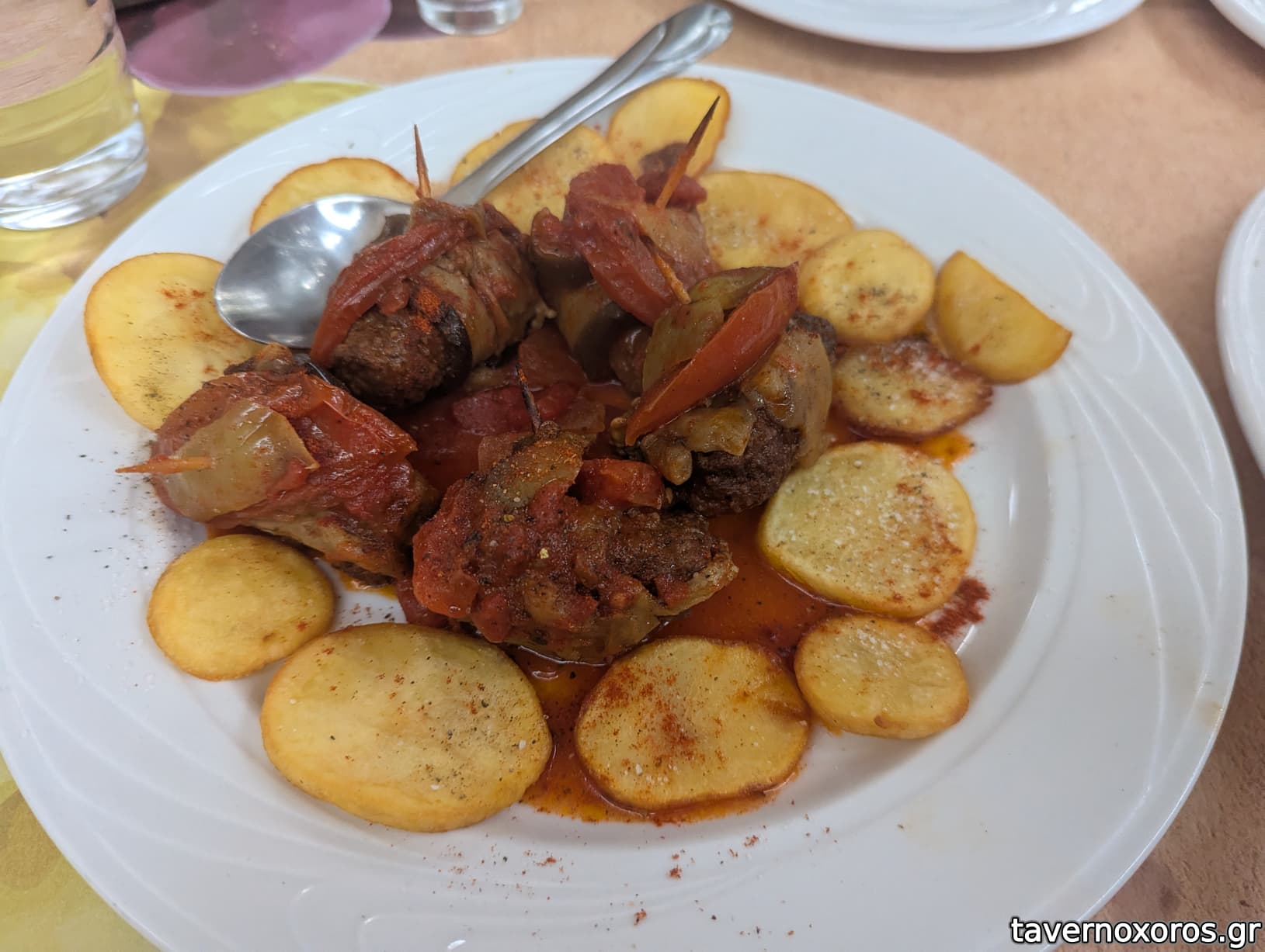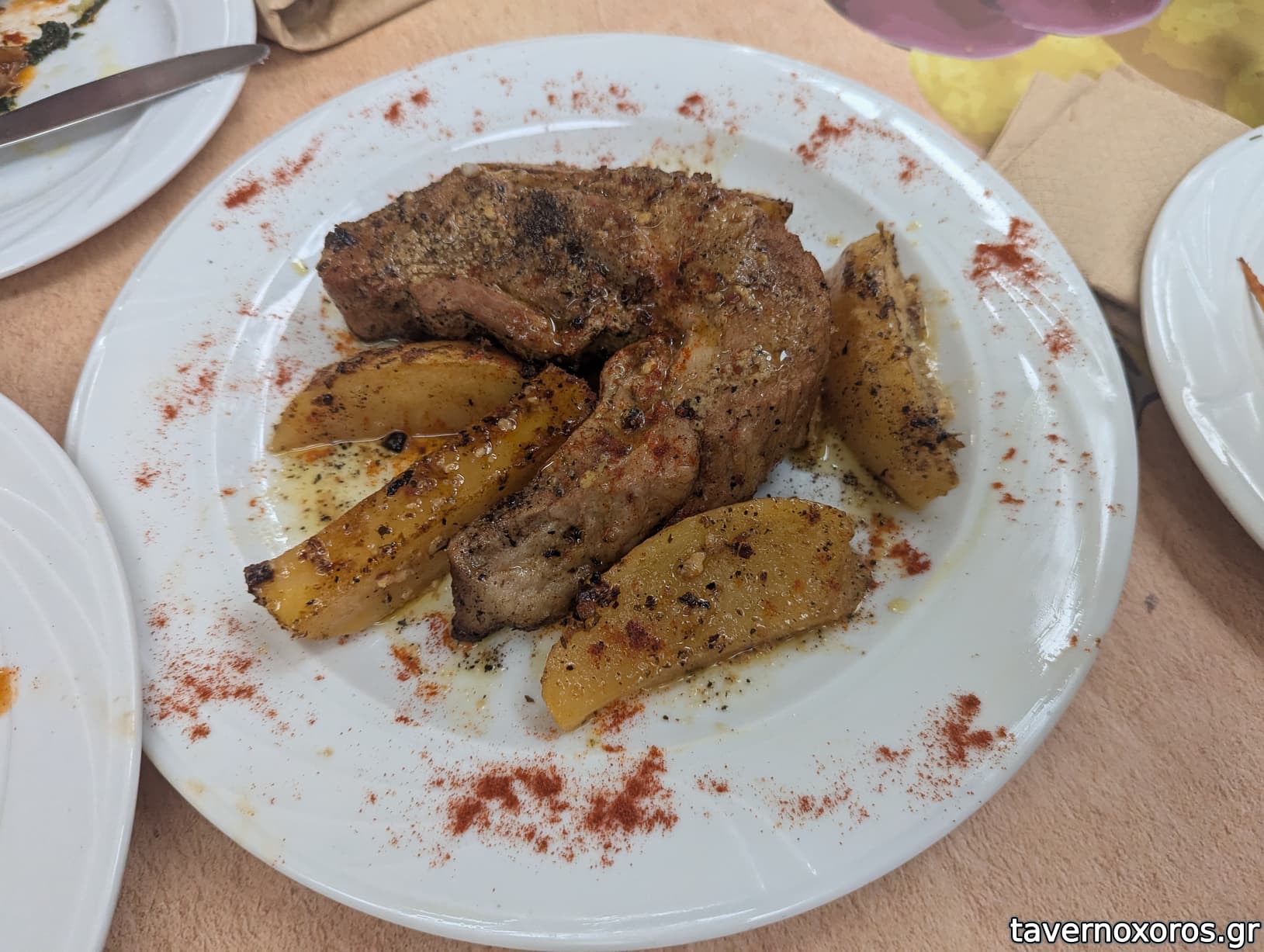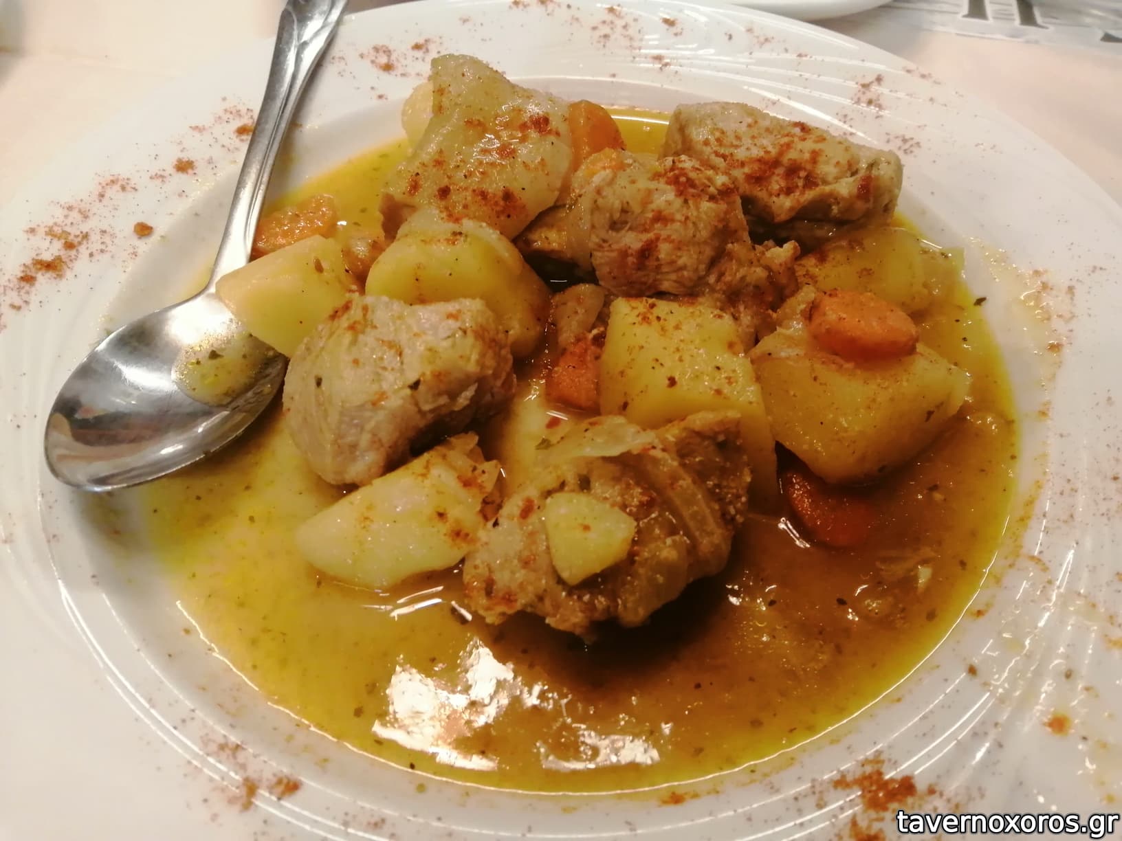 "Παπαμανώλης" (χοιρινό με σάλτσα κρασιού, πατάτες, καρότο, νόστιμο αλλά παιδική η μερίδα)
