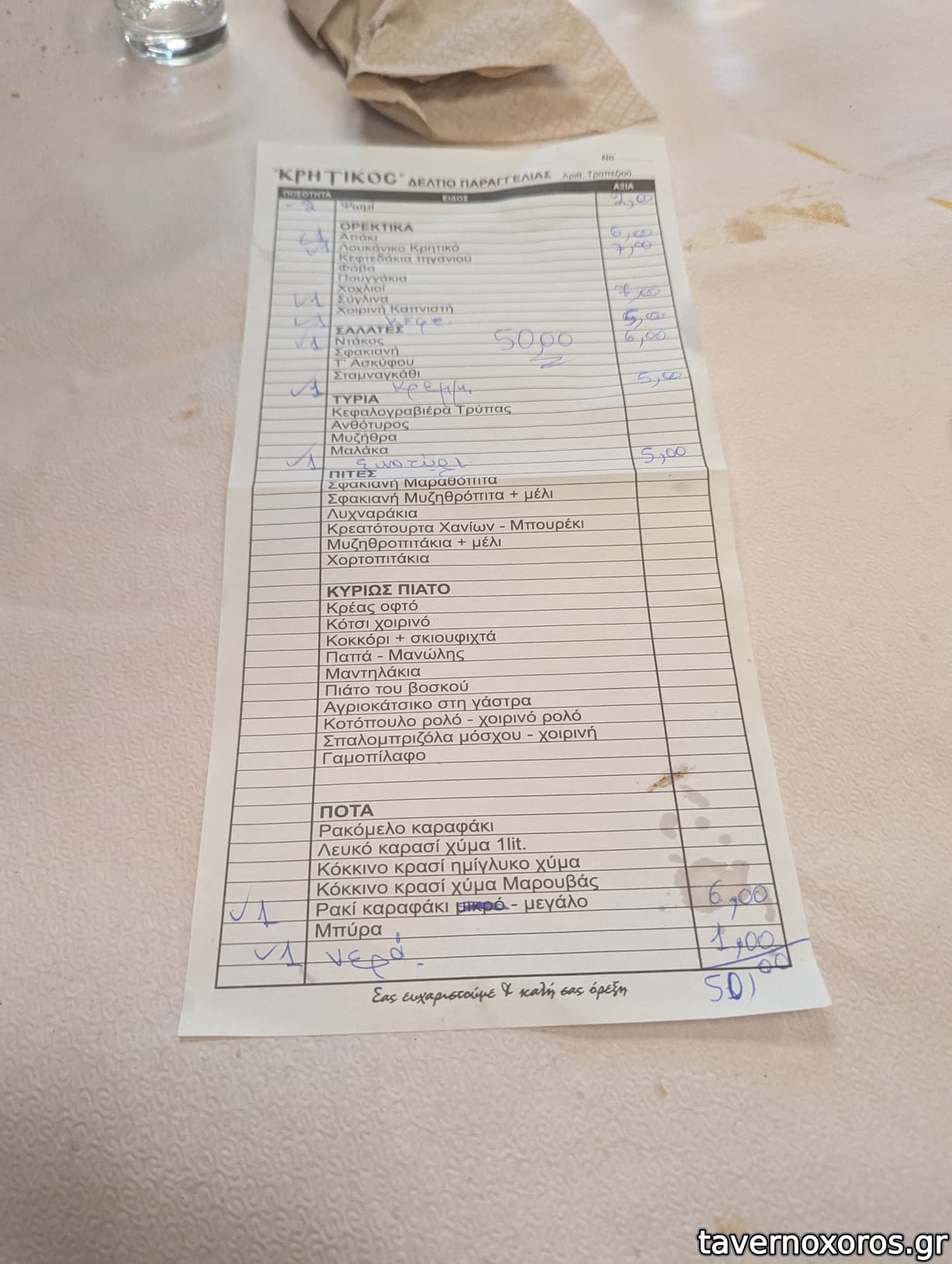 Κάποια πιάτα πολύ καλά, όπως ξυδάτο λουκάνικο με αυγό, κότσι (χωρίς την σάλτσα), σπιτική χορτόπιτα (πιο σπιτική πεθαίνεις), ξυνοτύρι, κάποια άλλα λιγότερο όπως οι κεφτέδες και οι πατάτες τηγανητές.