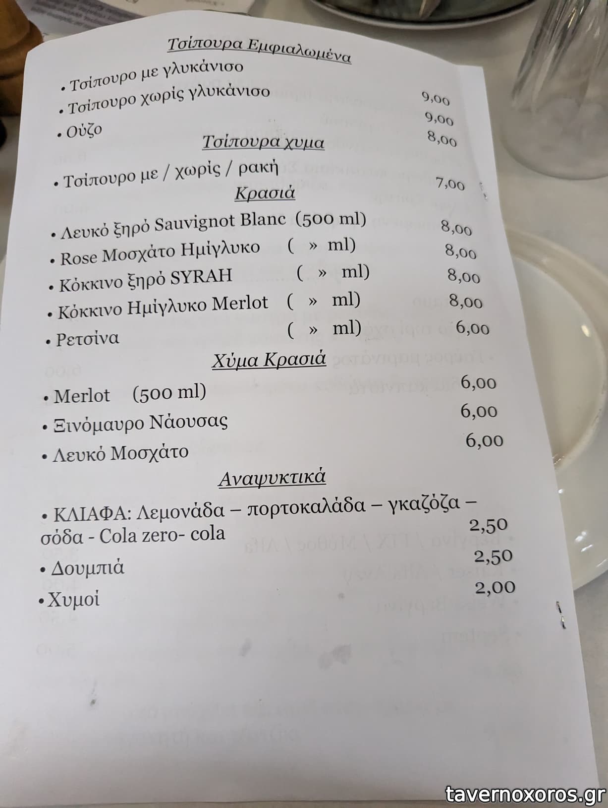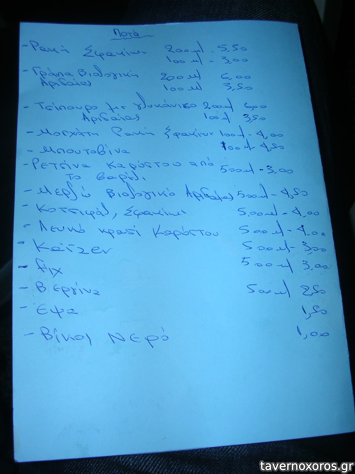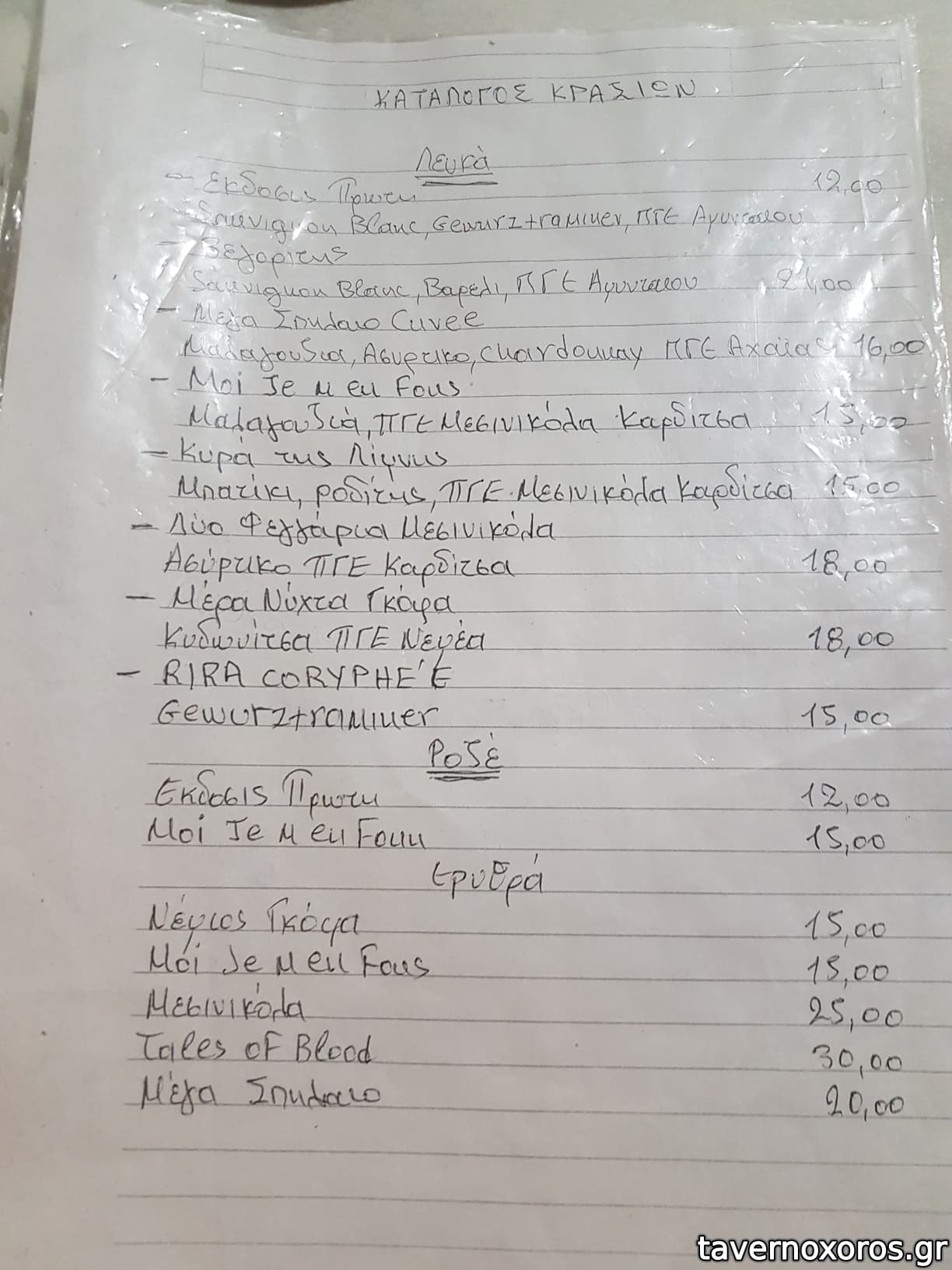 Κρασί Λευκό χύμα καλό, αρωματικό, προς το νερωμένο. Καλό κι αυτό, γιατί ήπιαμε αμέτρητα!