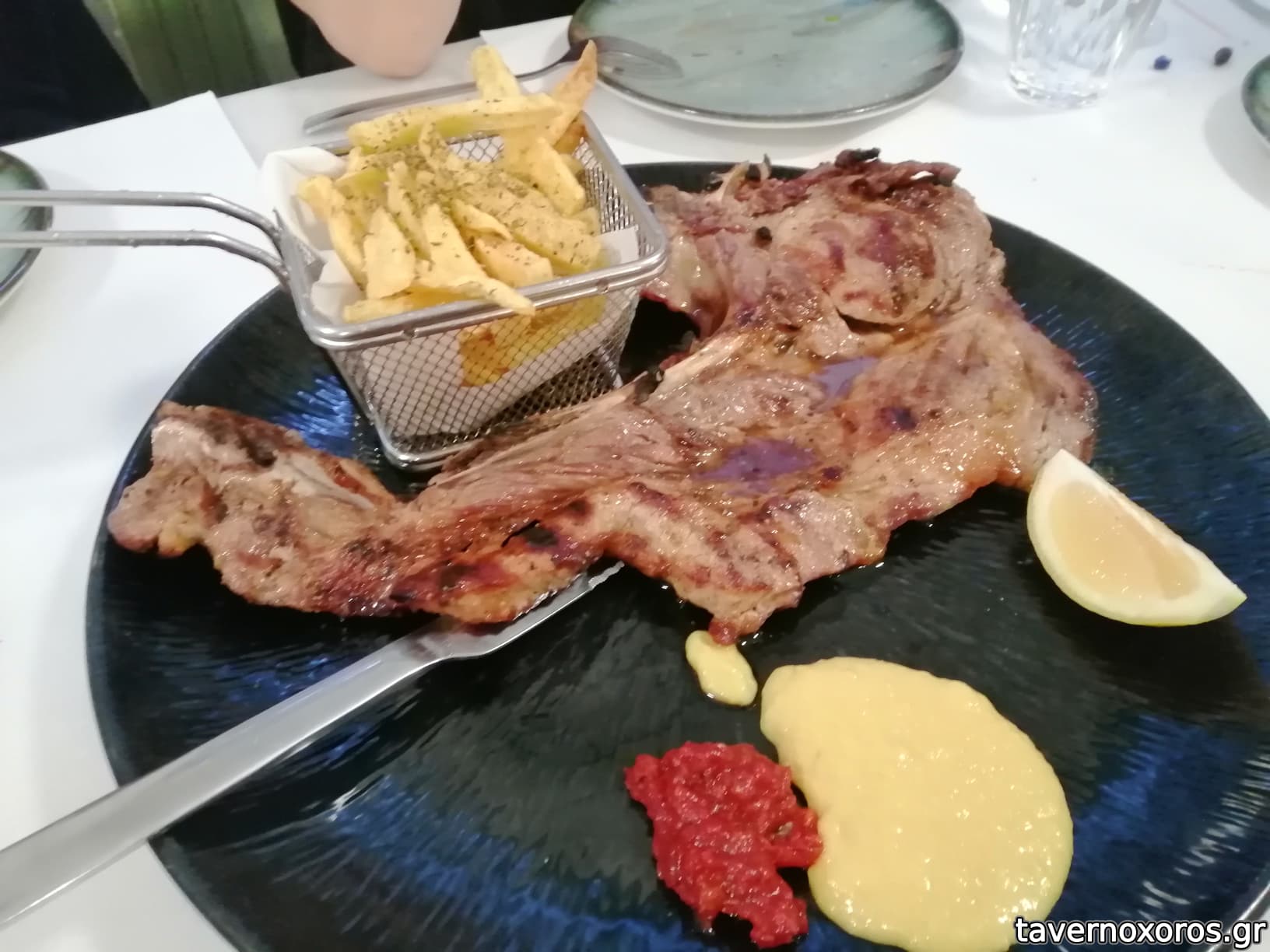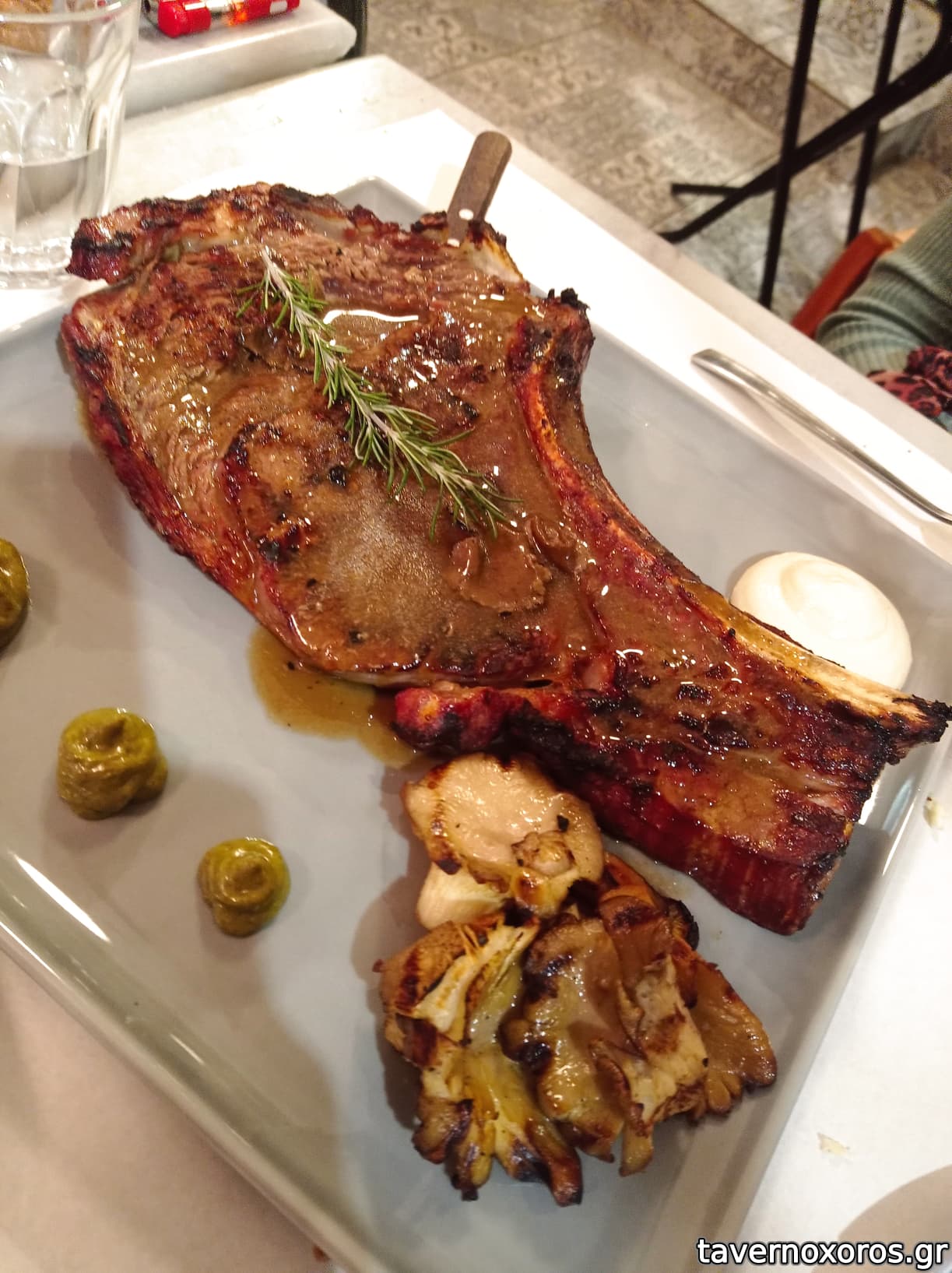 Μου άρεσε πολύ ο τρόπος παρουσίασης των πιάτων, με τα λαχανικά στην σχαρα σαν συνοδευτικά, ελίτσες στο μαστέλο, κάτι θυμάρια στην σπαλομπριζόλα και τα παιδάκια, μια τέλεια sauce συναπιού κτλ., γεγονός που δείχνει ότι ο chef το προσπαθεί. Πολύ καλό και το κερασμένο porto στο τέλος με το σαφράν!