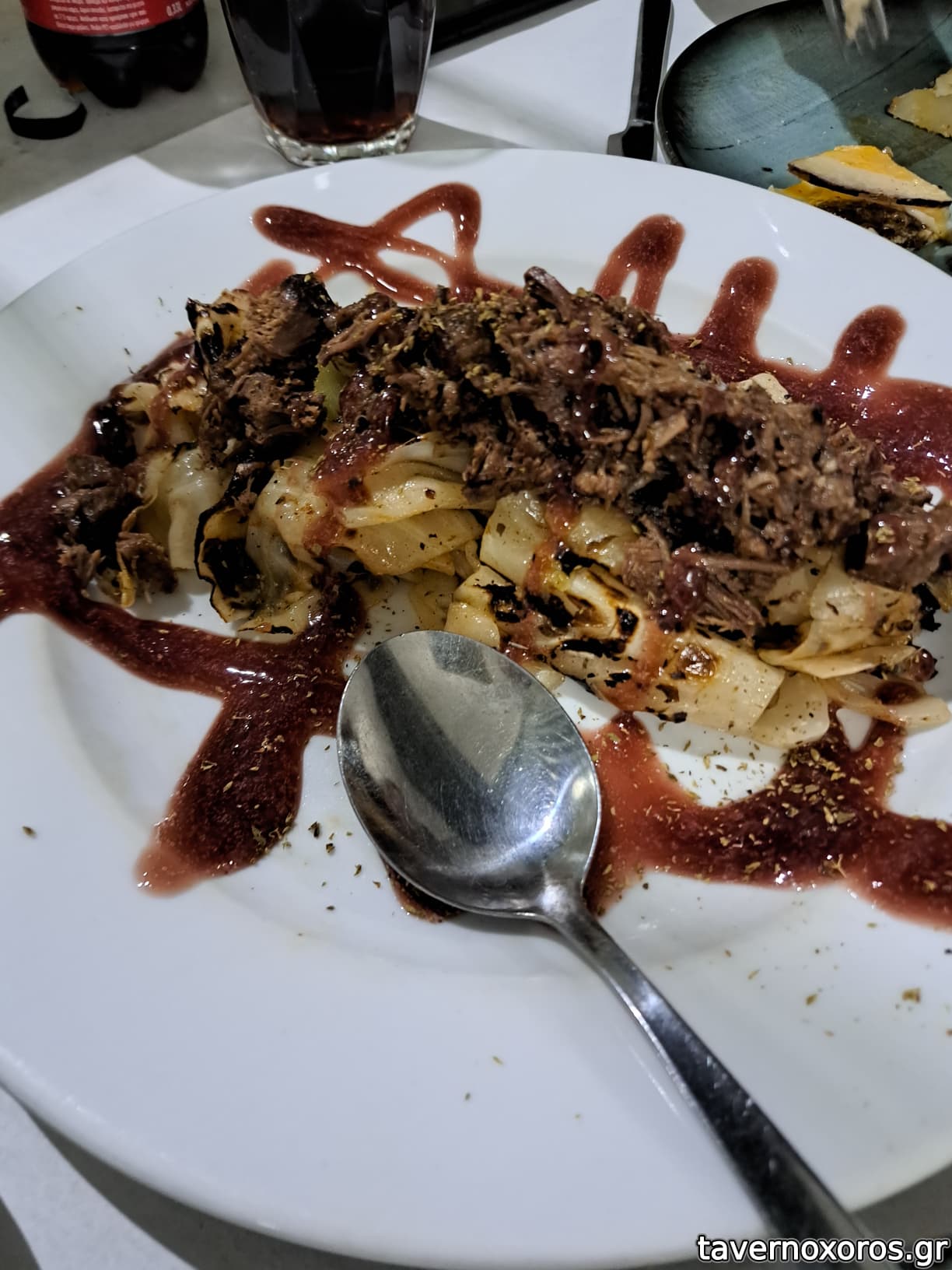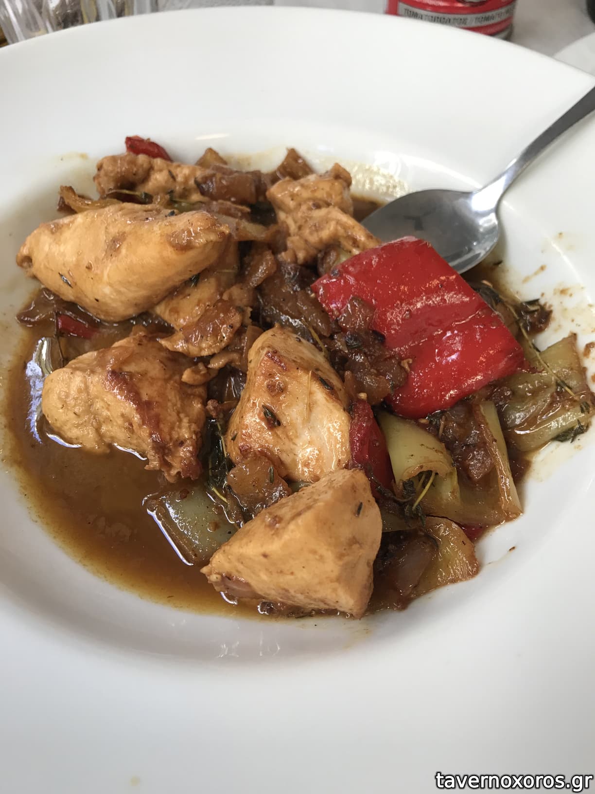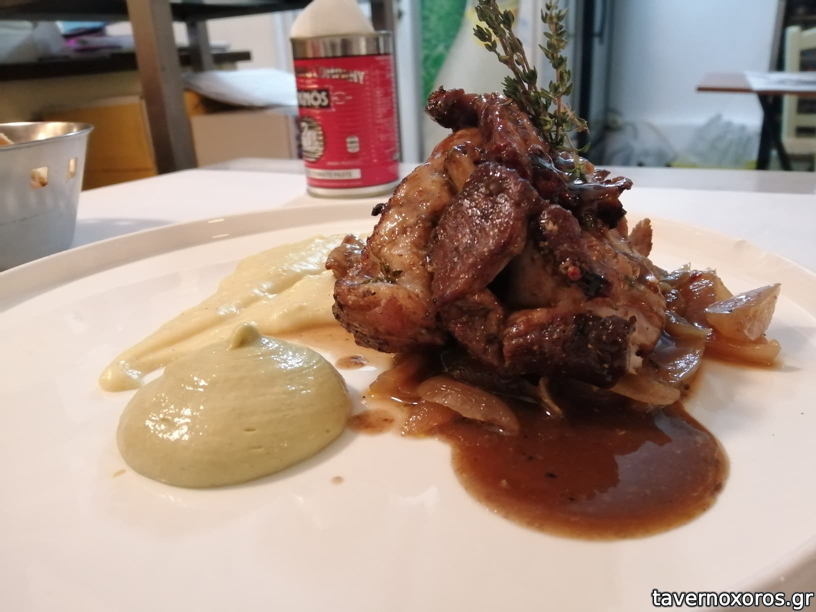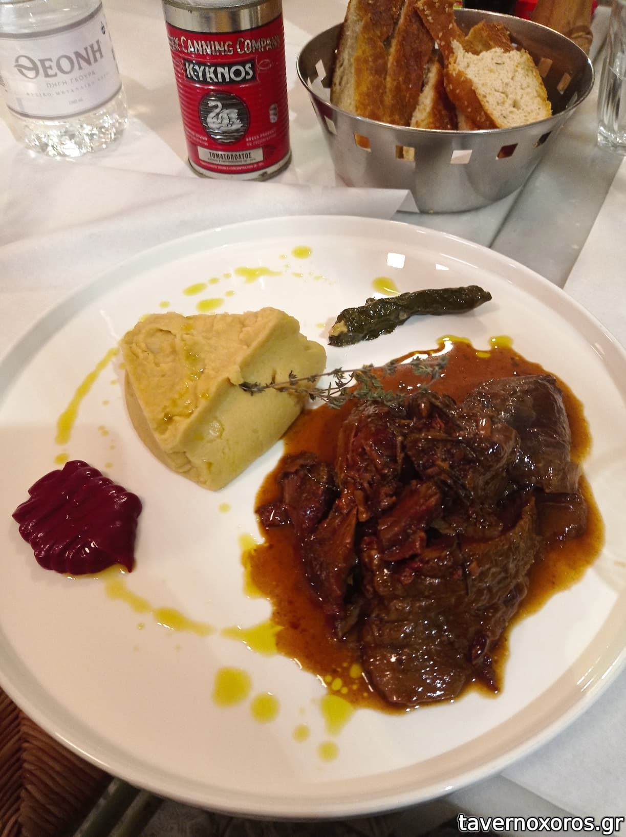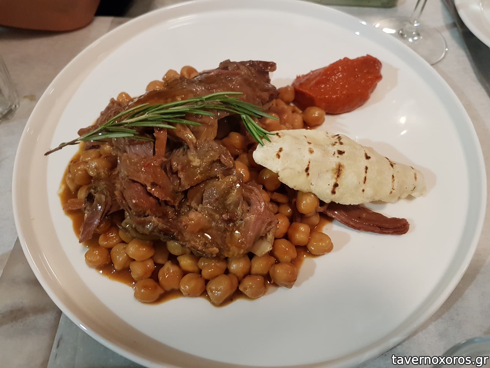 "Αρνί μπούτι μπρεζέ, με ρεβύθια, πάστα κόκκινης πιπεριάς κ σάλτσα εσπανιόλ" (το αρνί καλό, τα υπόλοιπα αδιάφορα)