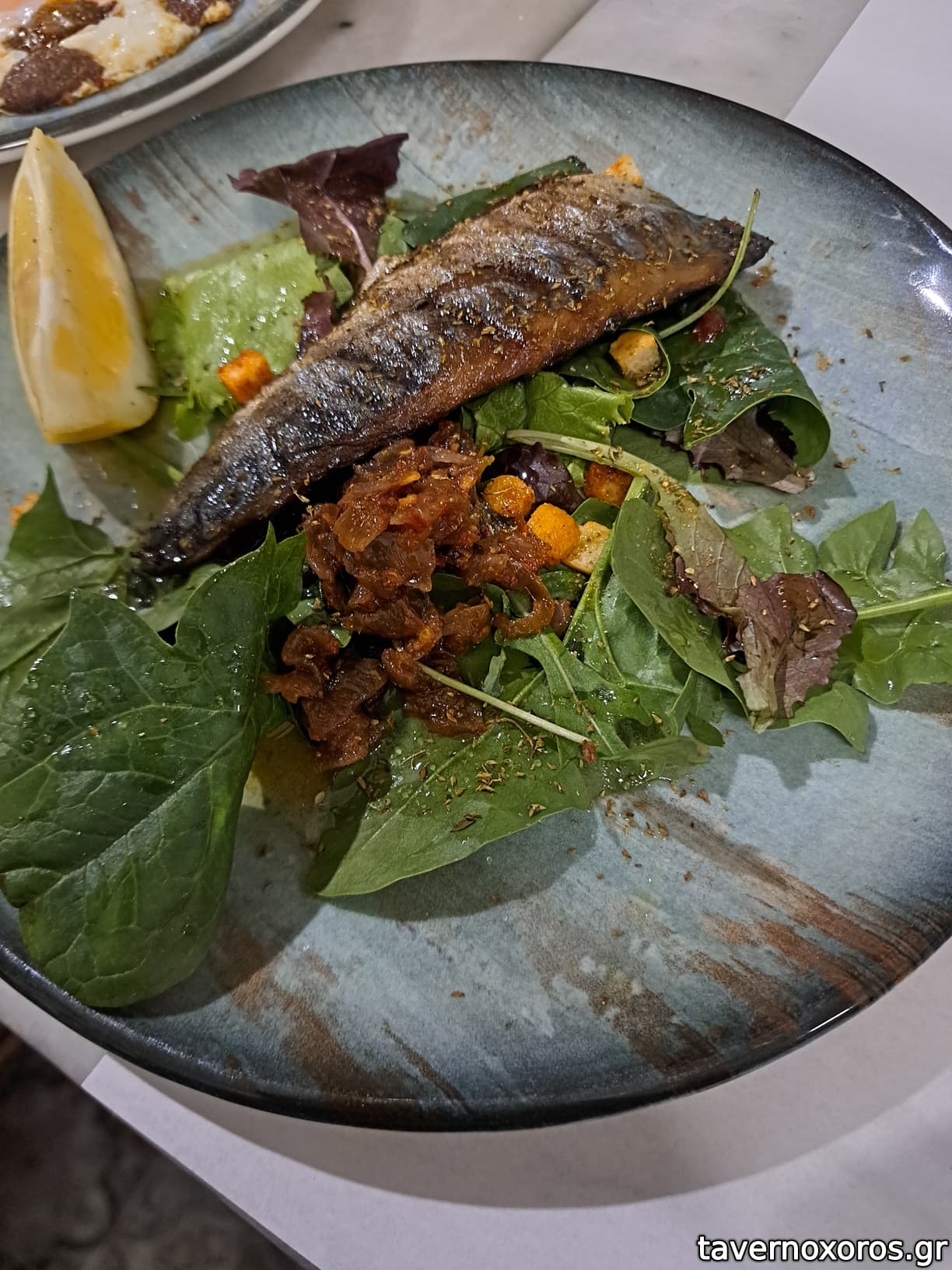 Σκουμπρί καπνιστό με λιαστή ντομάτα, κρίταμο, κρεμμύδια, σβησμένο με ούζο. Εξαιρετικό, καλής ποιότητας το ψάρι, έδεναν ωραία όλα τα υλικά.