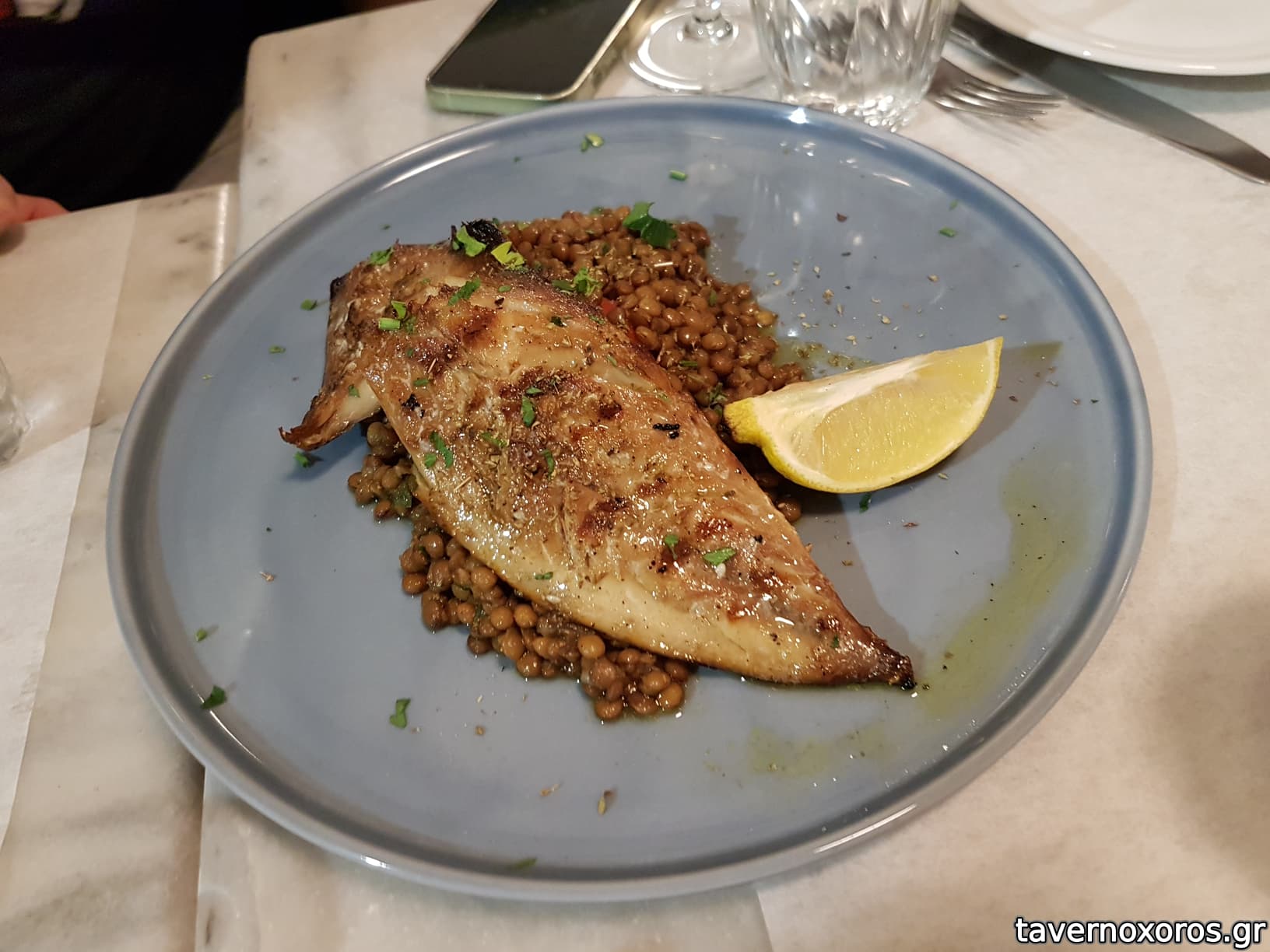 "Φακές ποσέ, με σκουμπρί καπνιστό Κομοτηνής στην σχάρα" (πολύ μέτριο)