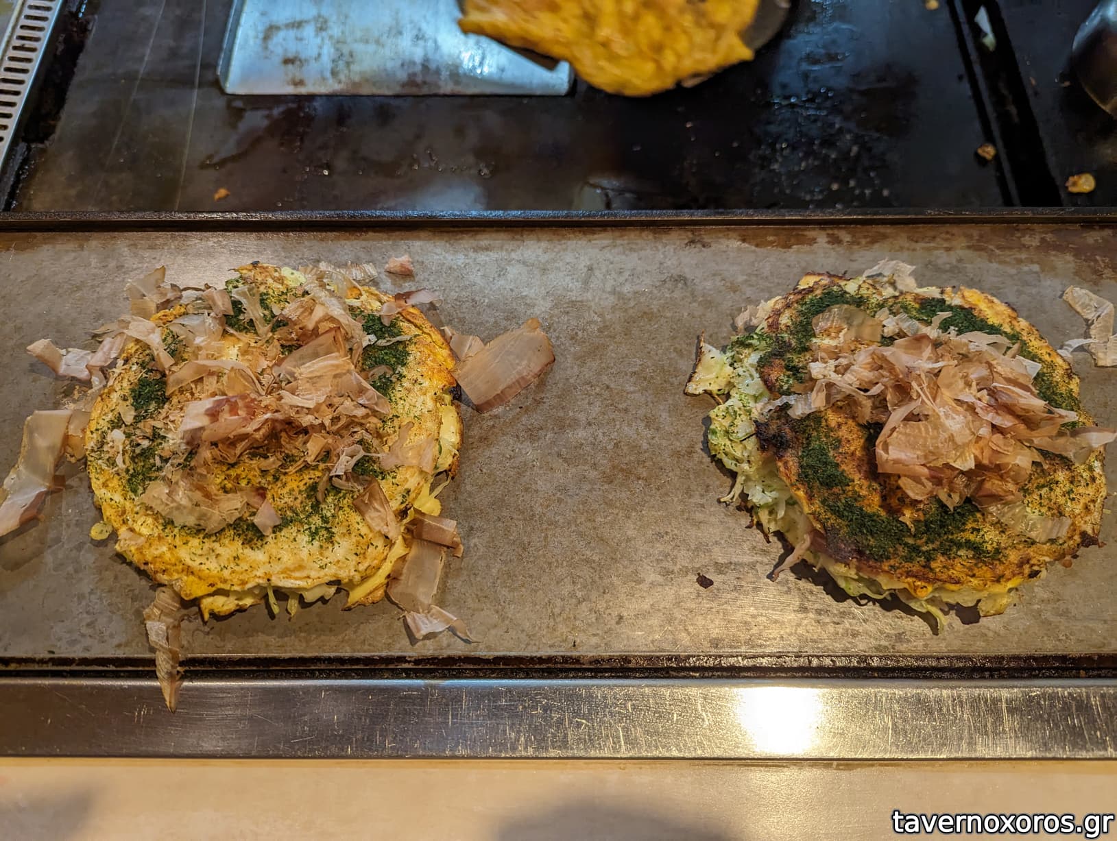 To okonomiyaki είναι κάτι σαν αλμυρή κρέπα, που φτιάχνεται με αλεύρι, αυγό, ψιλοκομμένο λάχανο και ότι άλλο μπορείς να φανταστείς, π.