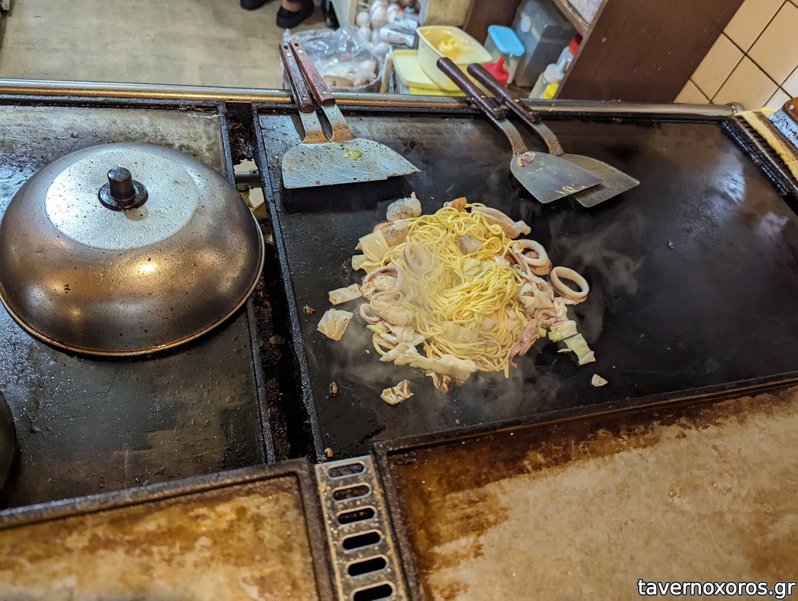 To okonomiyaki είναι κάτι σαν αλμυρή κρέπα, που φτιάχνεται με αλεύρι, αυγό, ψιλοκομμένο λάχανο και ότι άλλο μπορείς να φανταστείς, π.χ. noodles, καλαμάρι, βοδινό, μπαχάρια και σάλτσες.