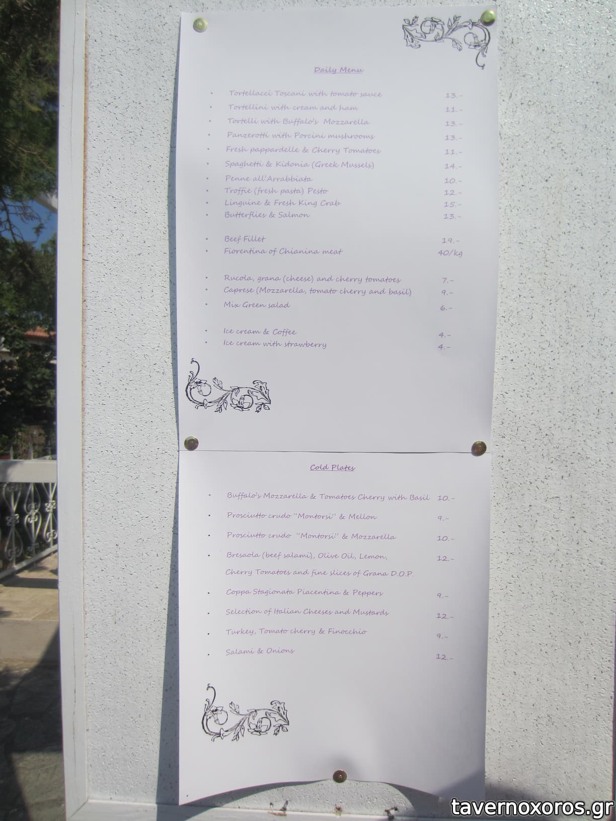 - Μικρός κατάλογος που αλλάζει, πάντα με κάποιες επιλογές ζυμαρικών, λίγα κρεατικά και μερικά κλασικά ιταλικά ορεκτικά/σαλάτες. Από τα λίγα που δοκιμάσαμε, θα έλεγα ότι το φαγητό είναι αξιοπρεπές. Κάτι φρέσκα ζυμαρικά με μανιτάρια που πήρα εξαιρετικά. Οι μερίδες (πλην του Fiorentina steak των 1200γρ!) είναι όλες μικρές, σερβιρισμένες σε μεγάλα πιάτα.