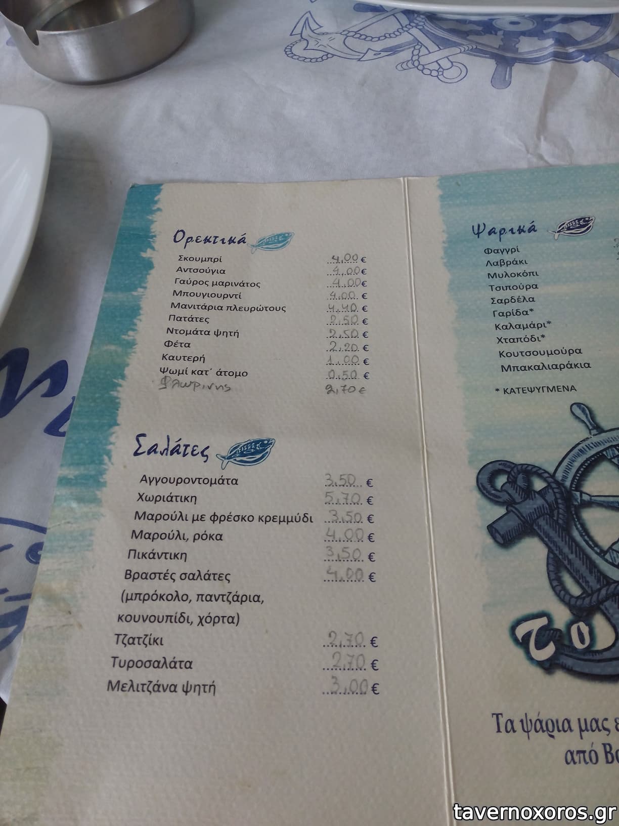 - Έχει μικρό κατάλογο, με ορεκτικά σαλάτες, και ψαρικά. Όλα τα θαλασσινά είναι όλα κατεψυγμένα. και τα ψάρια είναι όλα ιχθυοτροφείου, "