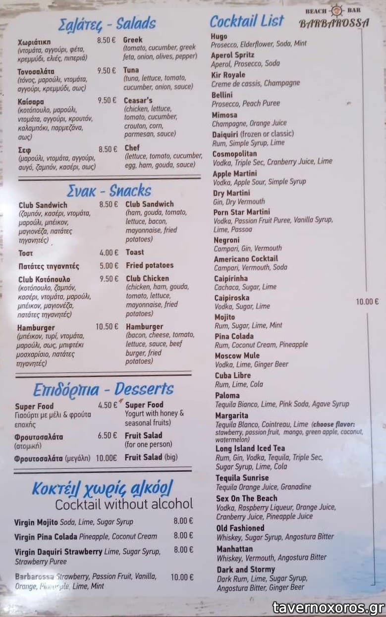 | Λέξεις κλειδιά | Μπαρμπαρόσα, #ξαπλώστρες, #beach bar, #κατάλληλο για παιδιά, #γρασίδι, #coffee, #χυμοί, #γρανίτες, #τσάι, #smoothies, #snacks, #club sandwich, #burgers, #cocktails, #κολοκυθοκεφτέδες, #γαύρος μαρινάτος, #φάβα, #μελιτζάνα τηγανητή, #πιπεριές, #κολοκυθάκια, #χαλούμι, #γαλοτύρι, #μετσοβόνε, #ποικιλία τυριών, #μακαρονάδες, #χυλοπίτες, #σαλάτες, #γαύρος, #σαρδέλα, #αθερίνα, #θράψαλα, #μπακαλιάρος σκορδαλιά, #κουτσομούρες, #μυδοπίλαφο, #μπακαλιαράκια, #γαρίδες, #χταπόδι, #μύδια, #κοντοσούβλι, #μπιφτέκι, #χοιρινή, #μοσχαρίσια μπριζόλα, #κοτόπουλο, #λουκάνικο, #πανσέτα, #μπιφτέκι γεμιστό |