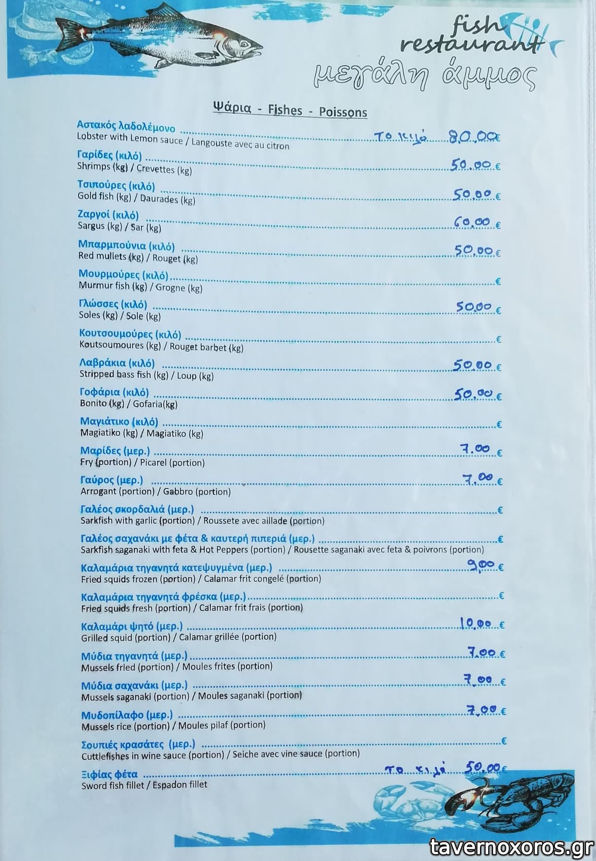 Φρεσκότατα ψάρια (όχι ποικιλία, 3 - 4 είδη), περιποιημένα, καλοψημένα.