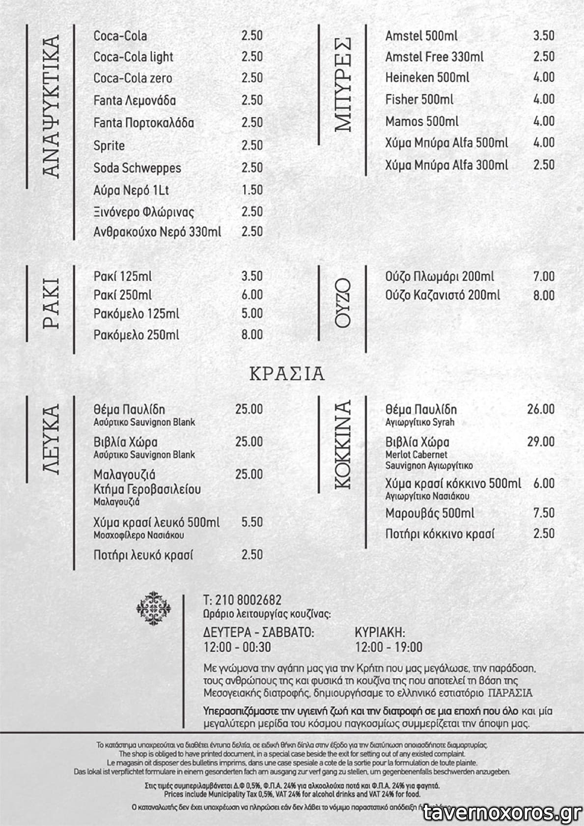 | Ωράριο | Τρ-Σα 13:00-01:00, Κυ 13:00-19:00, Δευτέρα κλειστά |