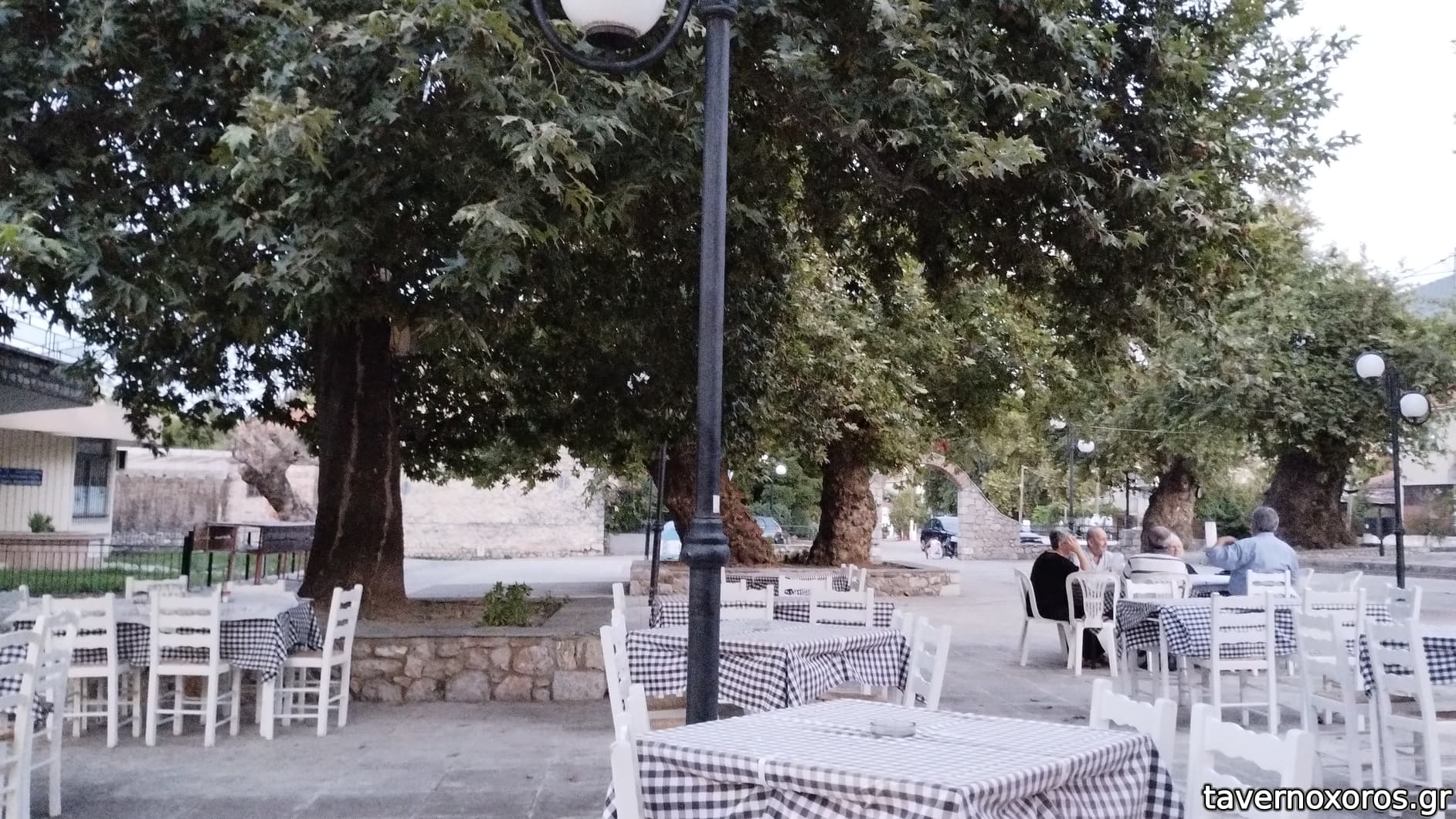 Δίπλα στα τραπέζια, βρύση και αιωνόβιος πλάτανος. Ωραία!