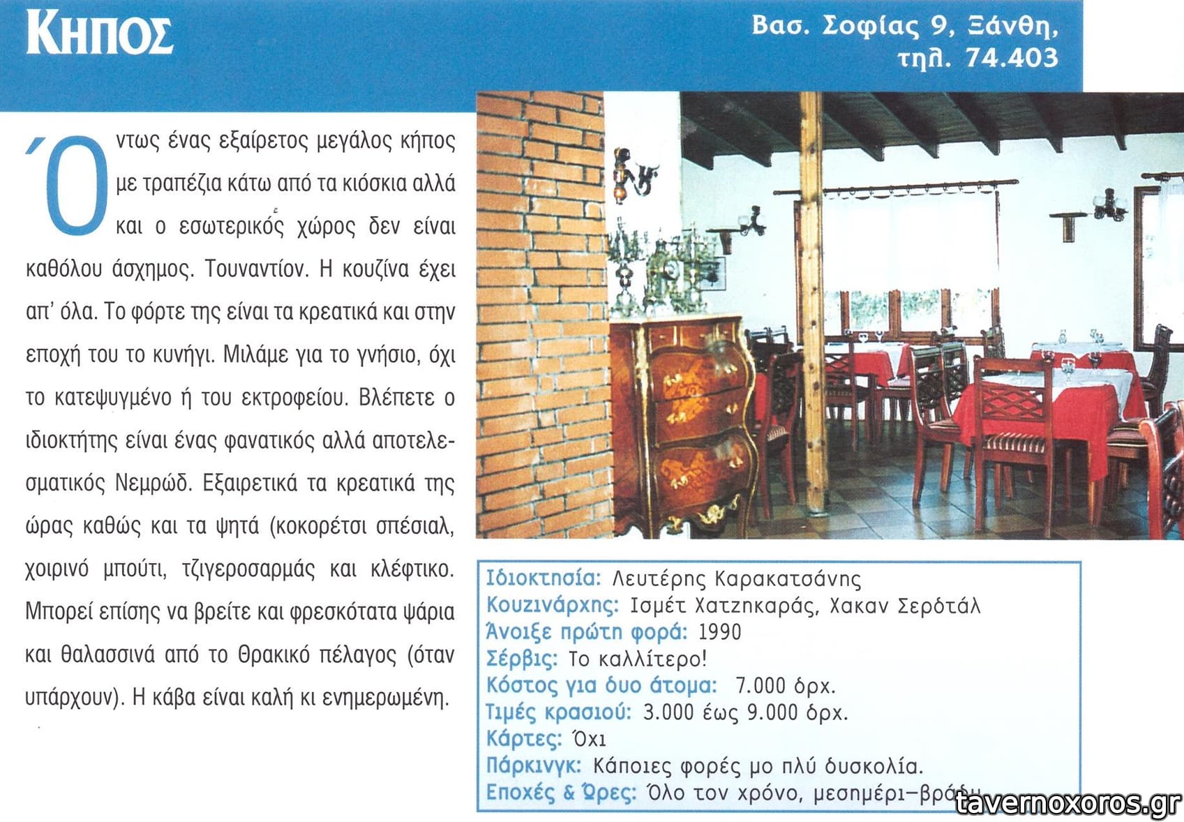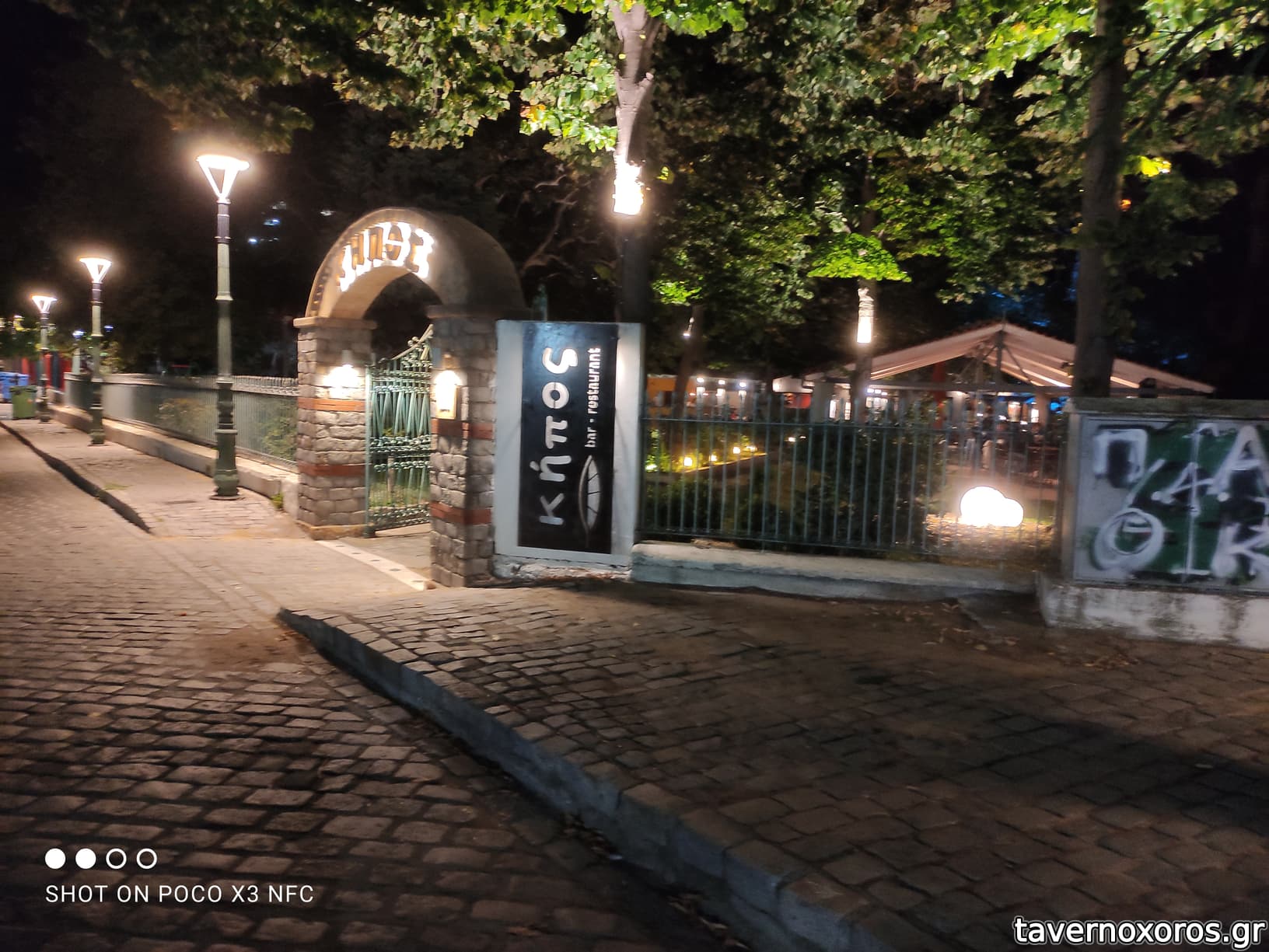 Βρίσκεται μέσα στον Δημοτικό Κήπο. Τα ακριανά τραπέζια έχουν θέα στον ποταμό Κόσυνθο. Το επιλέξαμε για φαγητό, αλλά εκ των υστέρων διαπιστώσαμε ότι οι περισσότεροι ντόπιοι έρχονταν μόνο για καφέ, ποτό κλπ. Παραγγείλαμε σαλάτα μαρούλι - ρόκα, σνίτσελ αλά κρεμ, μπιφτέκι γεμιστό, μπύρα, αναψυκτικό. Τιμές φυσιολογικές, σέρβις αργό, φαγητό μέτριο.