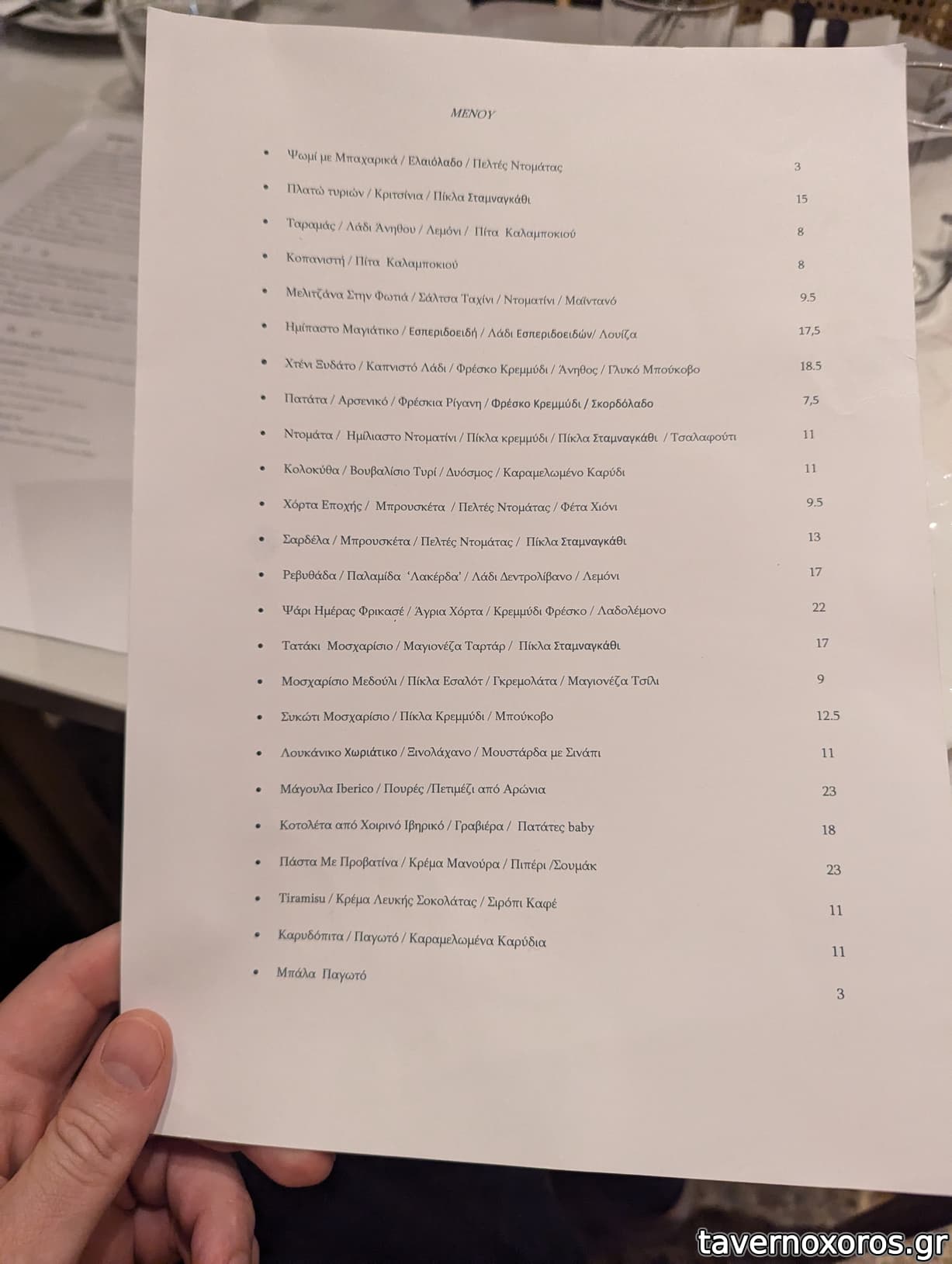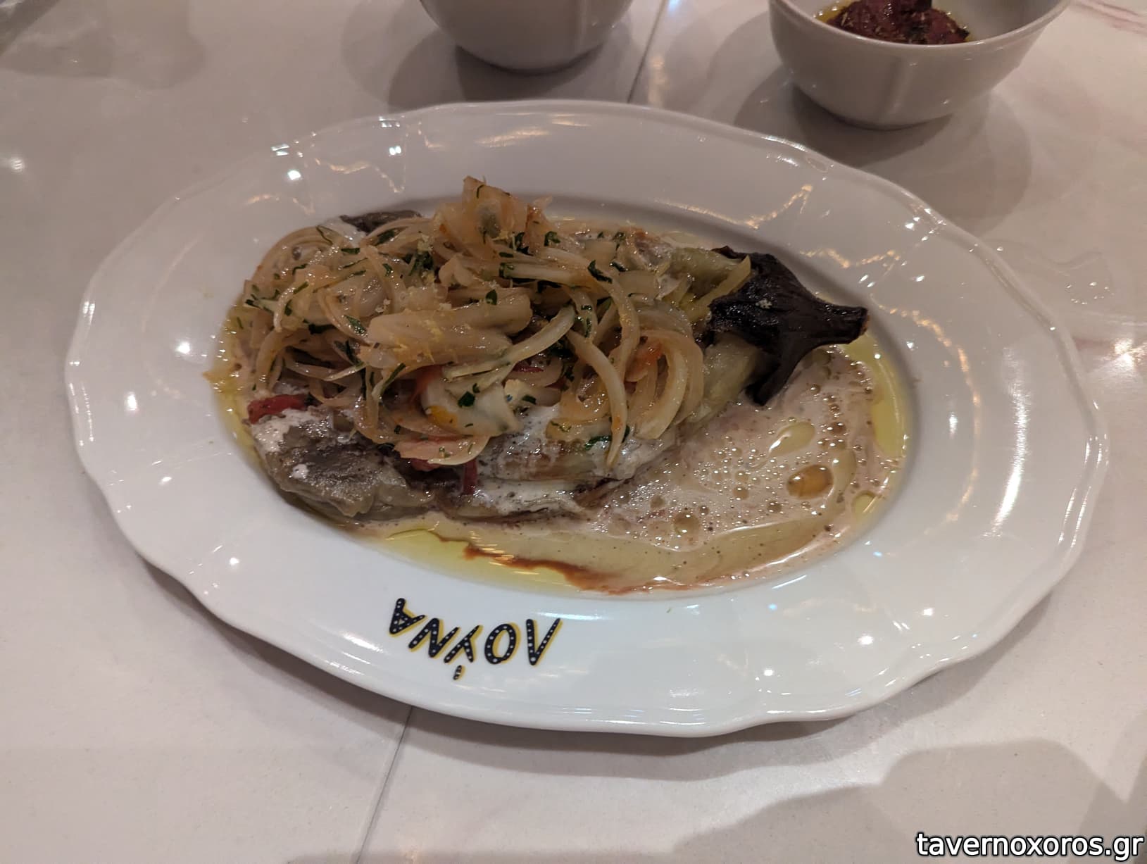 "Μπακαλιάρος Φρικασέ / Άγρια Χόρτα / Κρεμμύδι Φρέσκο / Λαδολέμονο" (καλό)