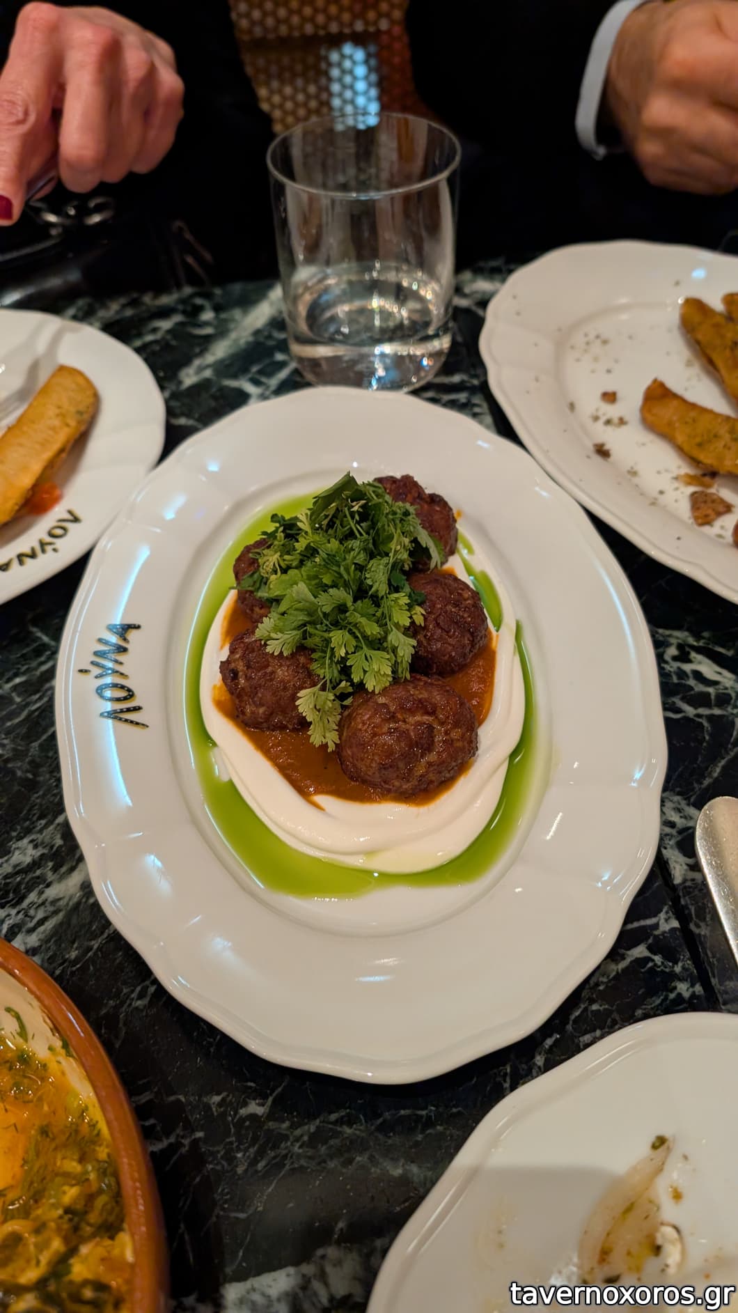 Κεφτεδάκια, σάλτσα πολίτικη, γιαούρτι (δίχασε την παρέα, προσωπικά τα βρήκα πολύ καλά, έντονα μπαχαρικά όπως κανέλα ή/και μοσχοκάρυδο)