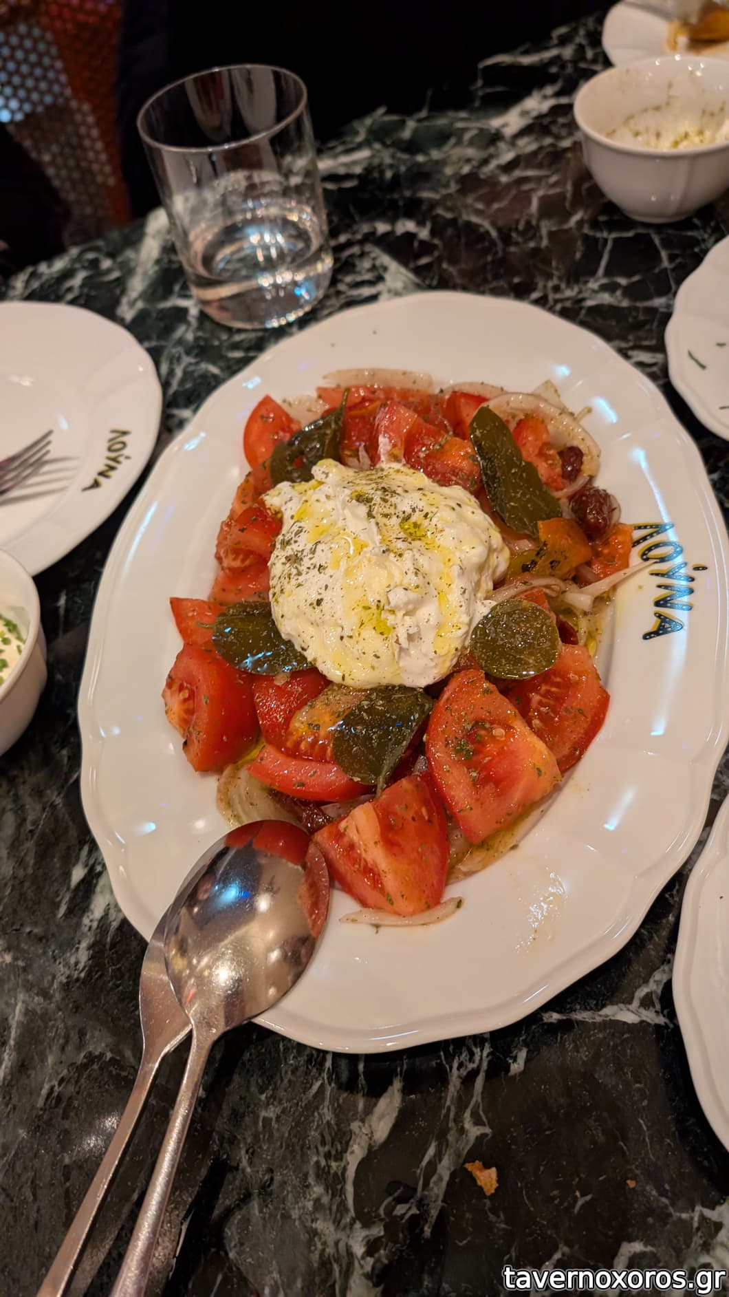 Ντομάτα, καπαρόφυλλα, κρεμμύδι, πίκλα πιπεριά Φλωρίνης, τσαλαφούτι (δίχασε την παρεά, προσωπικά τη βρήκα καλή, αν και αναγνωρίζω ότι αν η ντομάτα ήταν στην εποχή της θα ήταν πολύ καλύτερη)