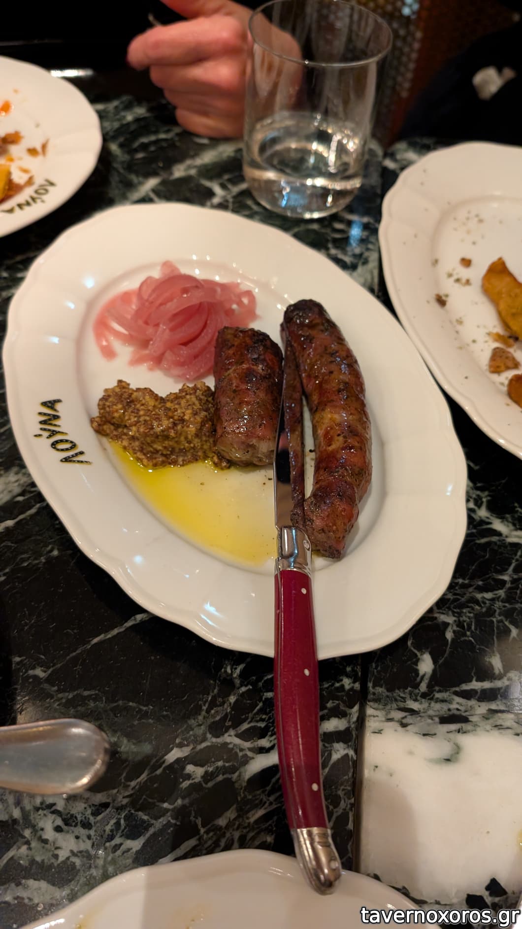 Λουκάνικο χωριάτικο, πίκλα κόκκινου κρεμμυδιού, σινάπι (απλώς οκ, δεν λείπει κομμάτι, έτσι ήρθε)