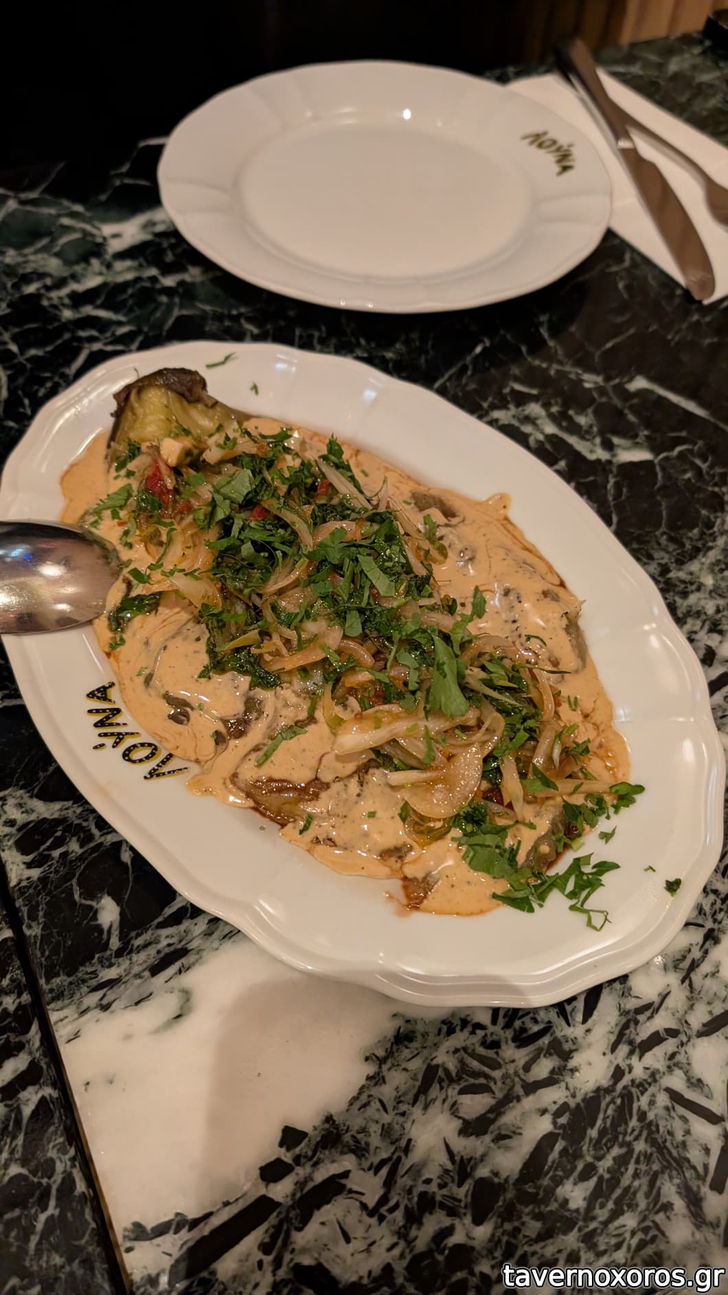 "Μελιτζάνα στην Φωτιά / Σάλτσα Ταχίνι / Ντοματίνι / Μαϊντανό" (καλή)