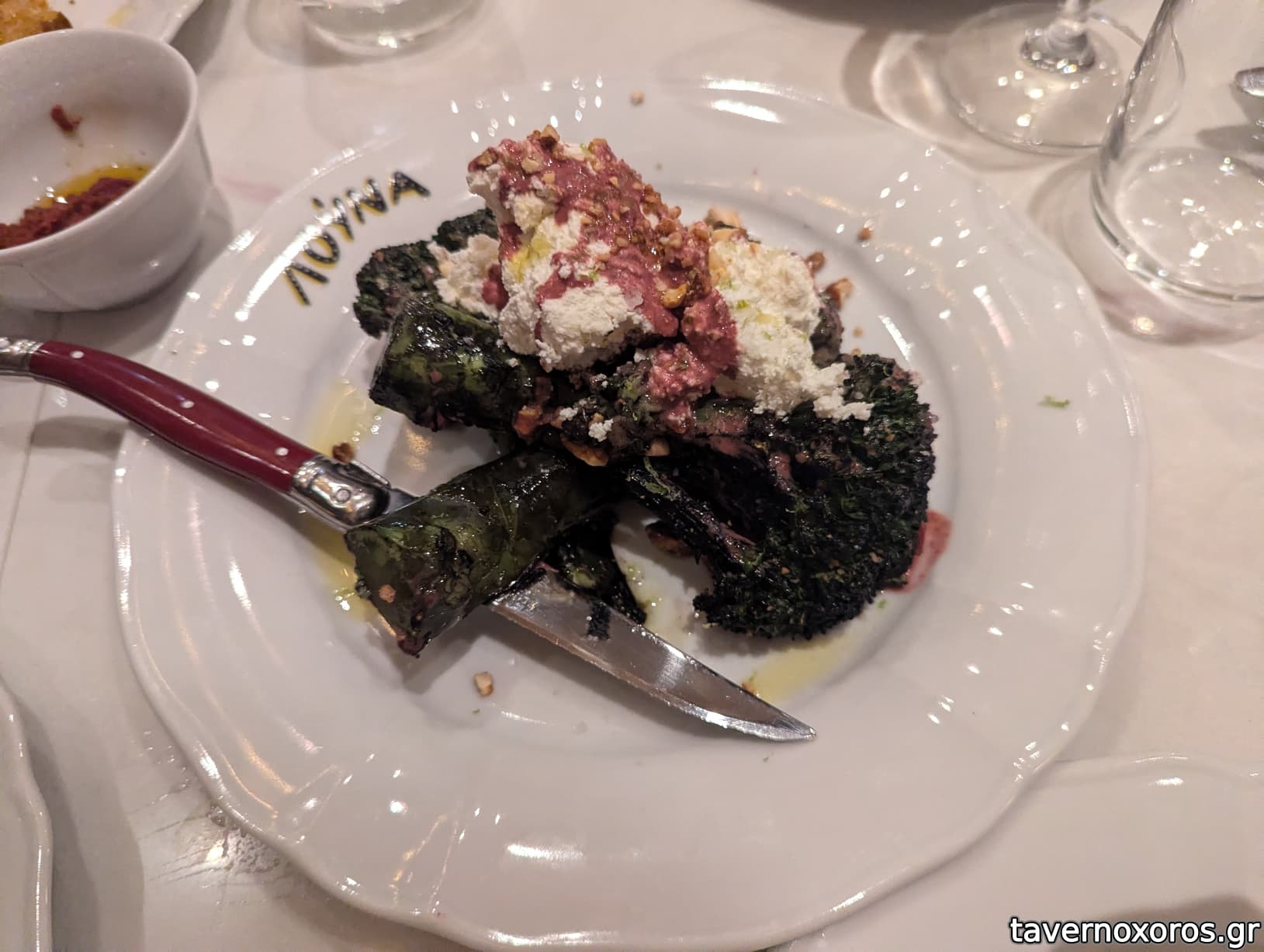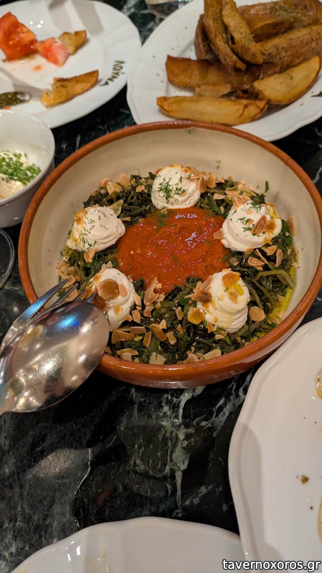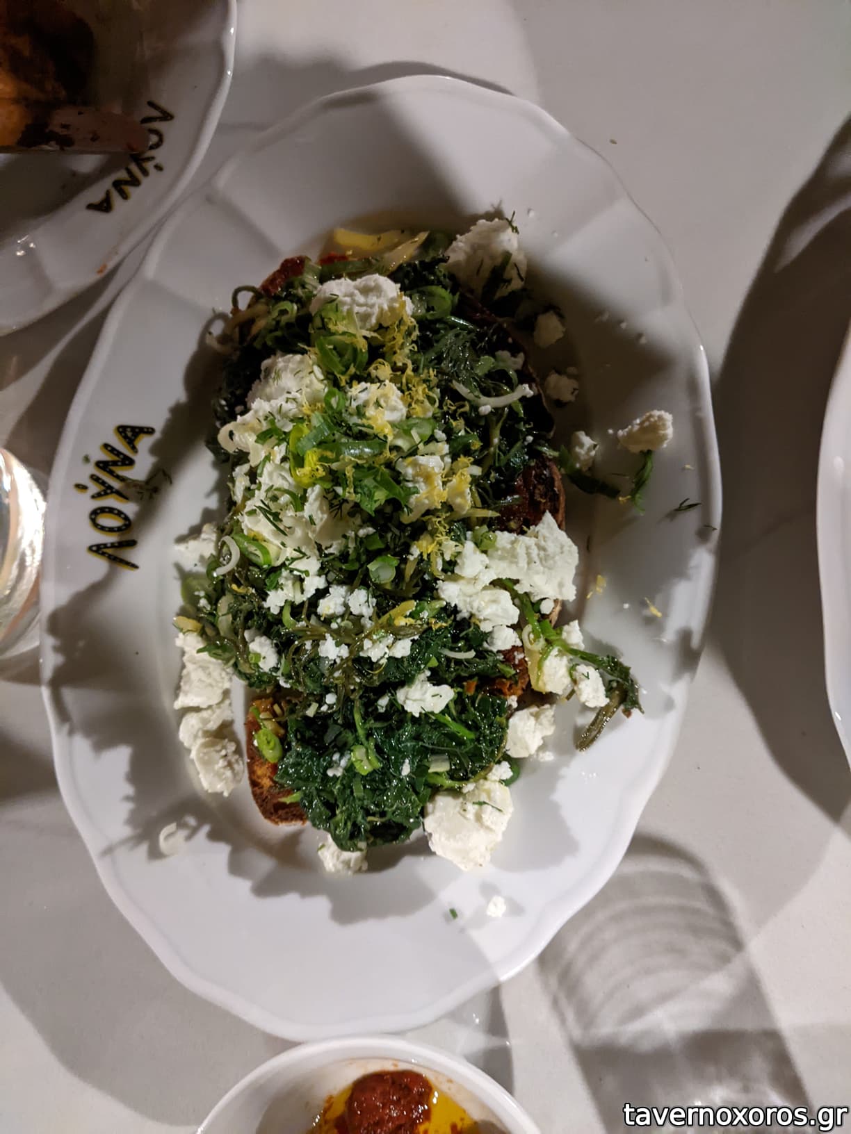 Χόρτα, αϊβάρ, λαδολέμονο, κατίκι Δομοκού, αμύγδαλο (ακολουθώντας την πρόταση της σερβιτόρας το ανακατέψαμε πριν δοκιμάσουμε και κατά συνέπεια χάθηκαν οι γεύσεις, δεν ξέρω πως θα ήταν αν δοκιμάζαμε κάθε μέρος ξεχωριστά)