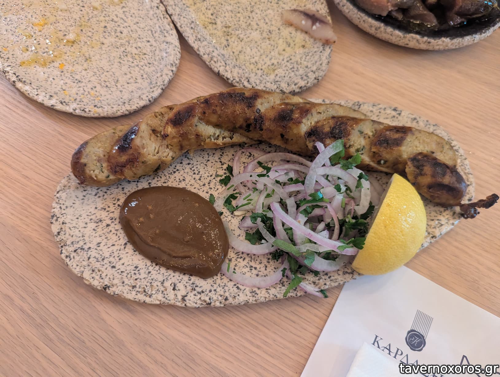 Λουκάνικο μαγιάτικου με μουστάρδα (ενδιαφέρον αλλά στεγνό, η συνοδευτική σως είναι απαραίτητη)