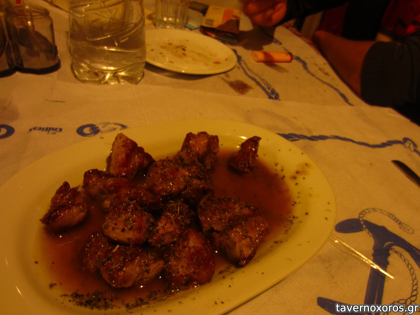 Από φαΐ: πήραμε κότσι (πολύ καλό, λουκουμιασμένο αλλά ανάλατο) με πατάτες φούρνου (πολύ καλές), τηγανιά (ωραία, πολλή ρίγανη), καπνιστή μπριζόλα με μανιτάρια (ωραία), κεφαλοτύρι τηγανιτό (ωραίο) και χωριάτικη (αρκετά καλή). Πολλή γεναιοδωρία στο λάδι. Έφερε πολύ και φρέσκο ψωμί. Μπύρα βαρέλι Primátor. Μας έφερε και νερό. Στο τέλος κορμό 4 μικροσκοπικά κομματάκια πασπαλισμένα με καρύδια από πάνω και σιρόπι σοκολάτας μέτριος αλλά ο κύριος ήταν πολύ ευγενικός και έμεινα ικανοποιημένος.