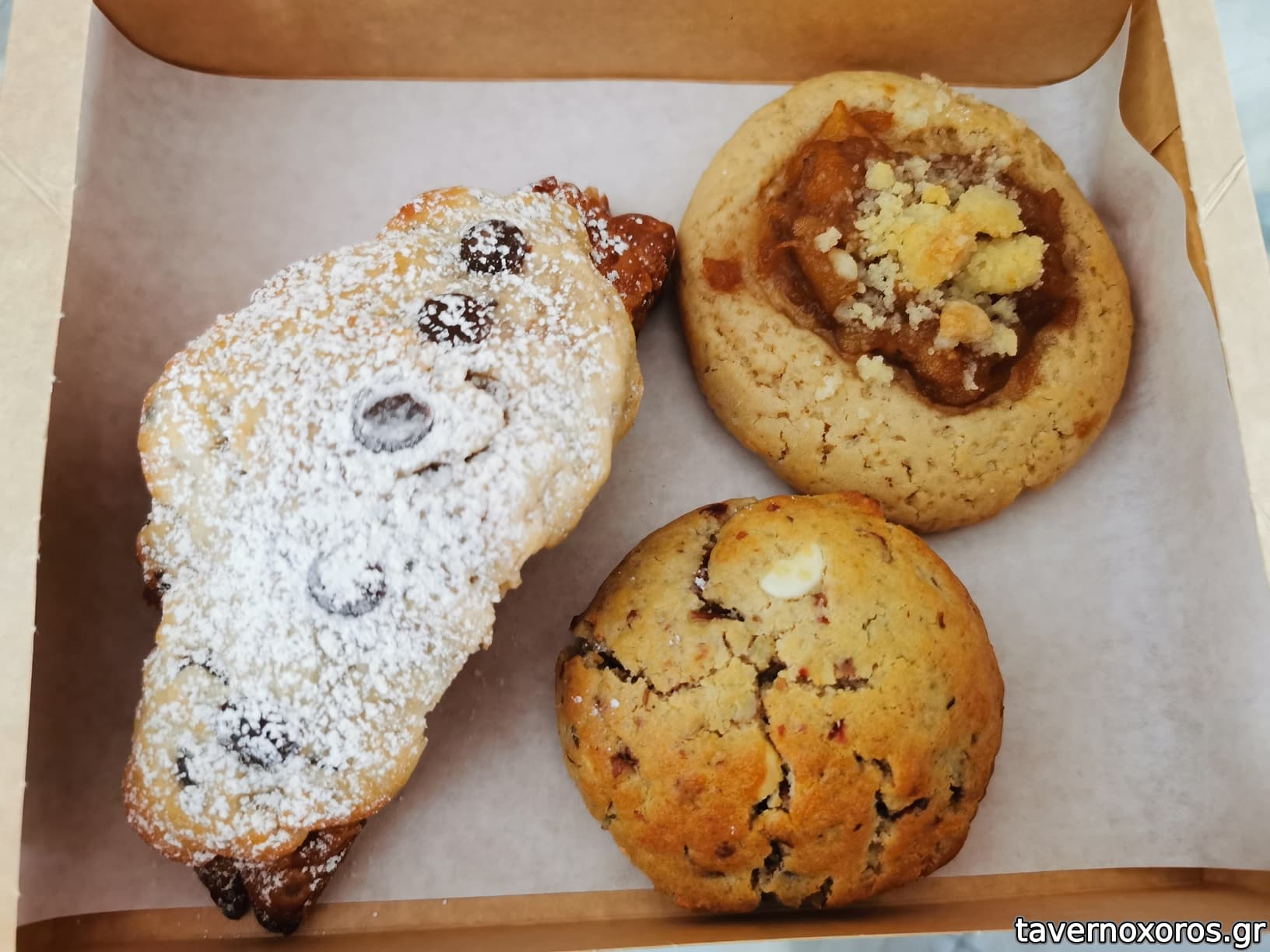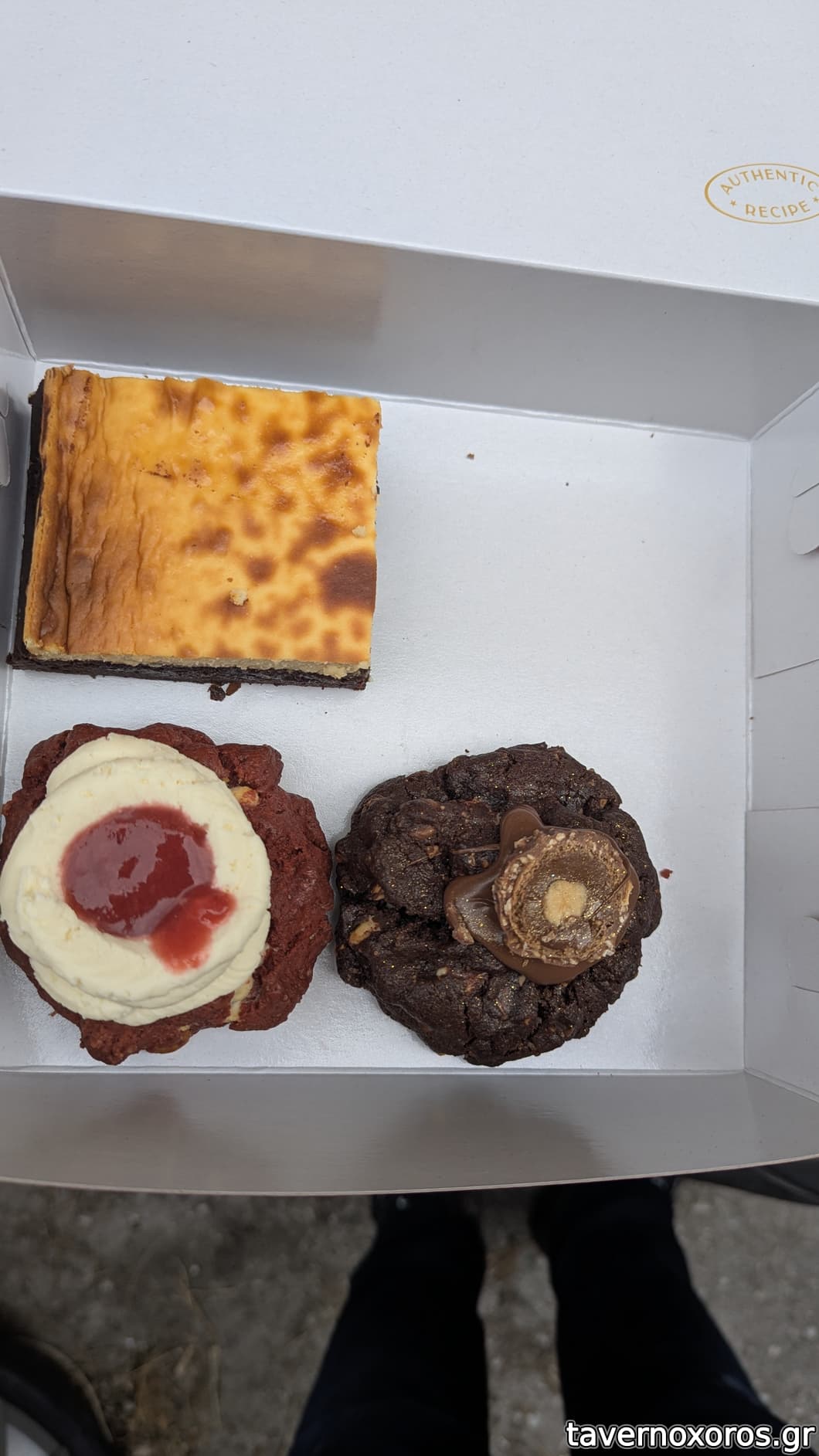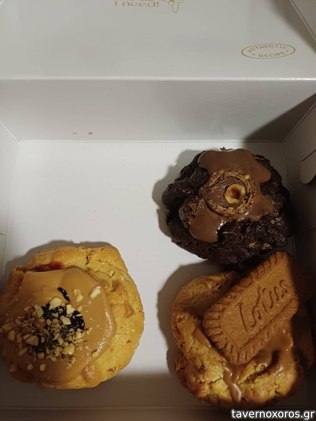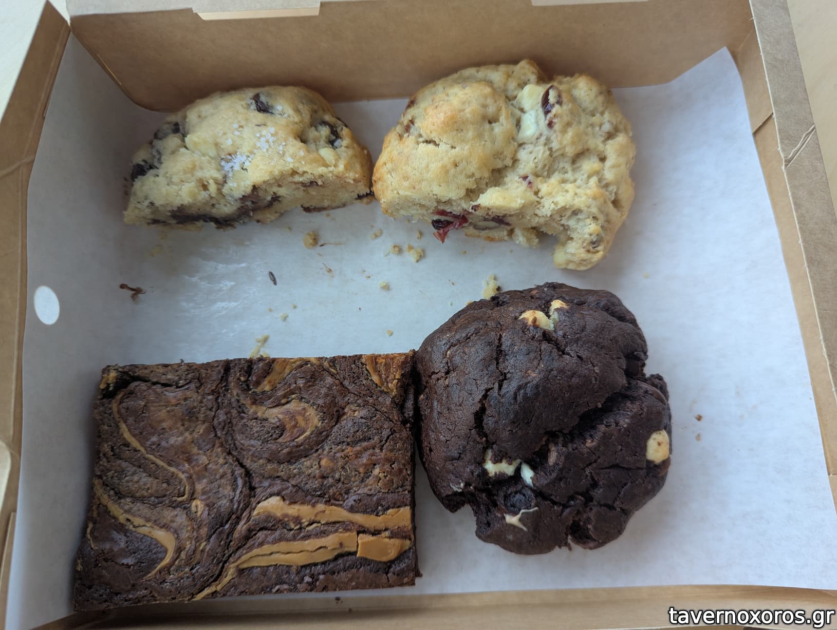 "Triple chocolate & salt" (καλό) & "Lemon zest": raspberry & lemon cookie (πολύ καλό) & Brownie με φυστικοβούτυρο (συγκριτικά με τα υπόλοιπα, με ενθουσίασε λιγότερο) & "Choco trouble" (καλό)