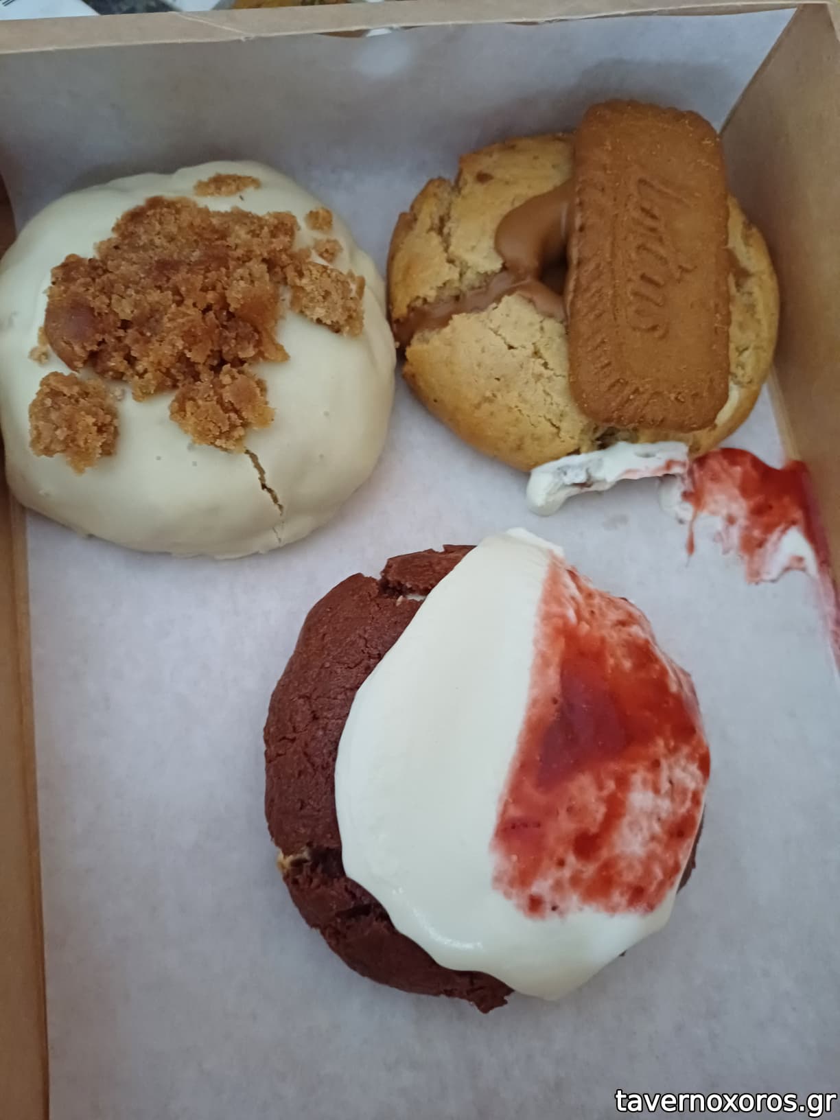Cookies (πολύ καλά, κυρίως αυτό με το μπισκότο από πάνω και μετά αυτό με την άσπρη σοκολάτα)