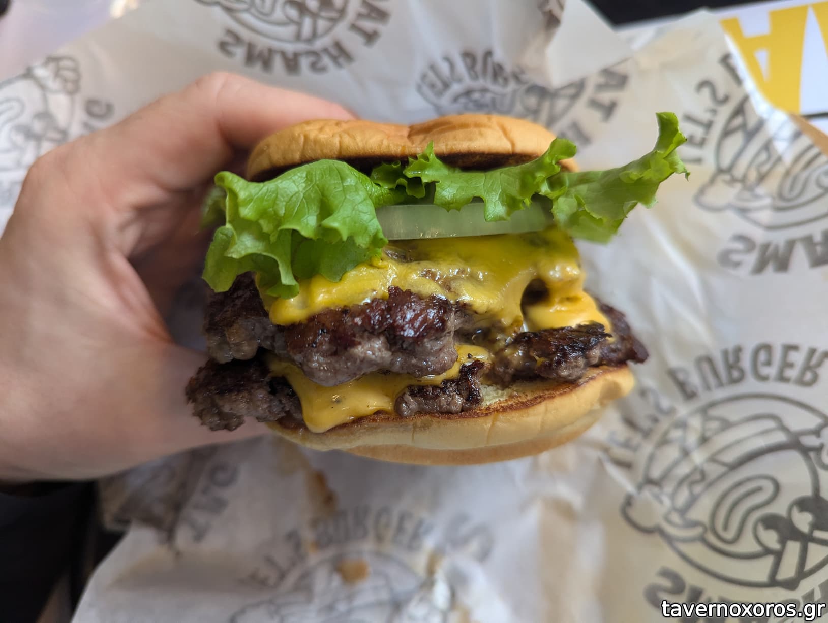 "Smash White" δηλαδή custom burger, με διπλό μπιφτέκι, american cheese, κρεμμύδι και μαρούλι (πολύ καλό)