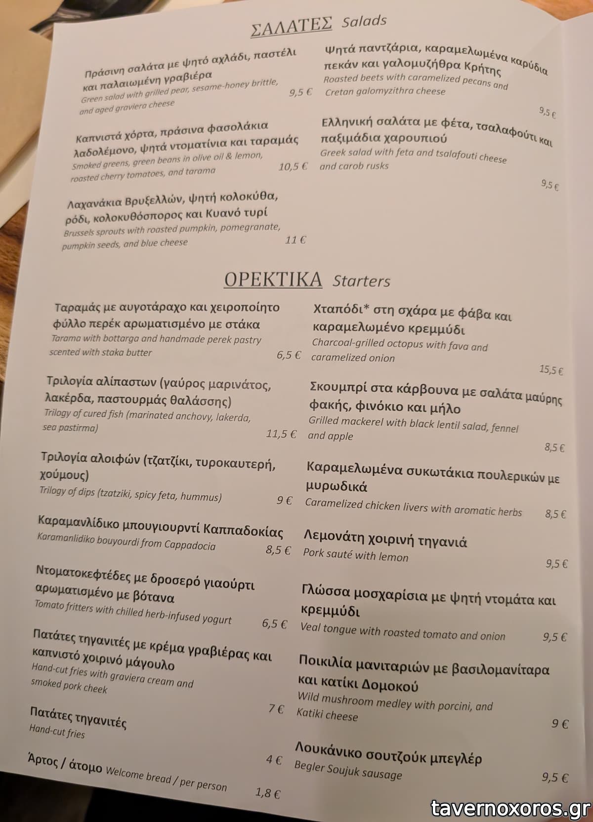 Ο κατάλογος είχε ελλείψεις σε αρκετά πιάτα, γεγονός που περιόρισε τις επιλογές. Ξεκινώντας από τα συνοδευτικά, το ψωμί τύπου λαβάς ήταν καλό, όπως και το σχαροτύρι. Η πράσινη σαλάτα με ψητό αχλάδι καλή, ενώ τα λαχανάκια Βρυξελλών με κρέμα κυανού τυριού ξεχώρισαν πολύ ισορροπημένο και με ένταση.
