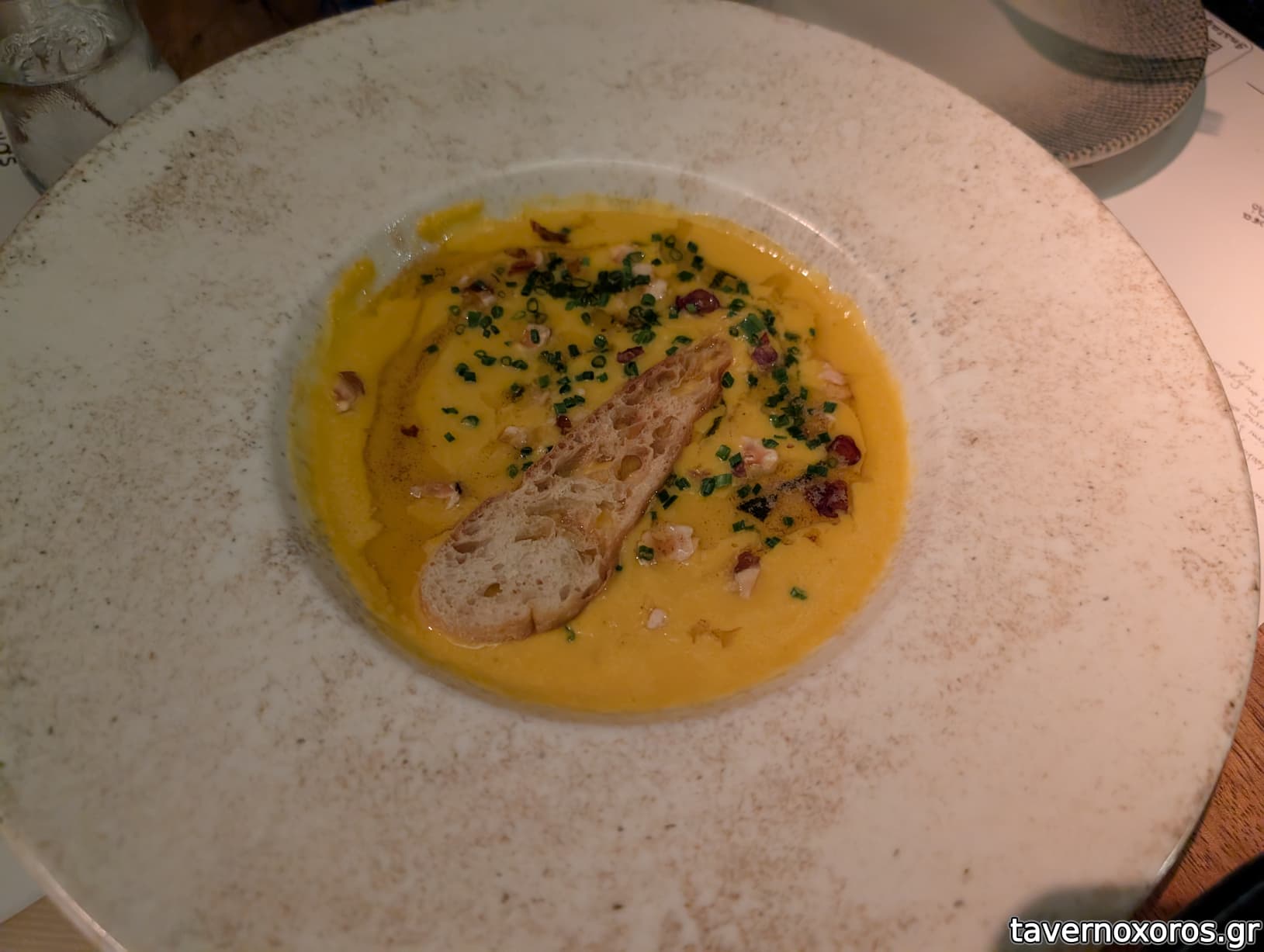 "Βελουτέ γλυκοκολοκύθας με κάστανα, φουντούκι και βούτυρο noisette με φασκόμηλο" (πολύ καλή)