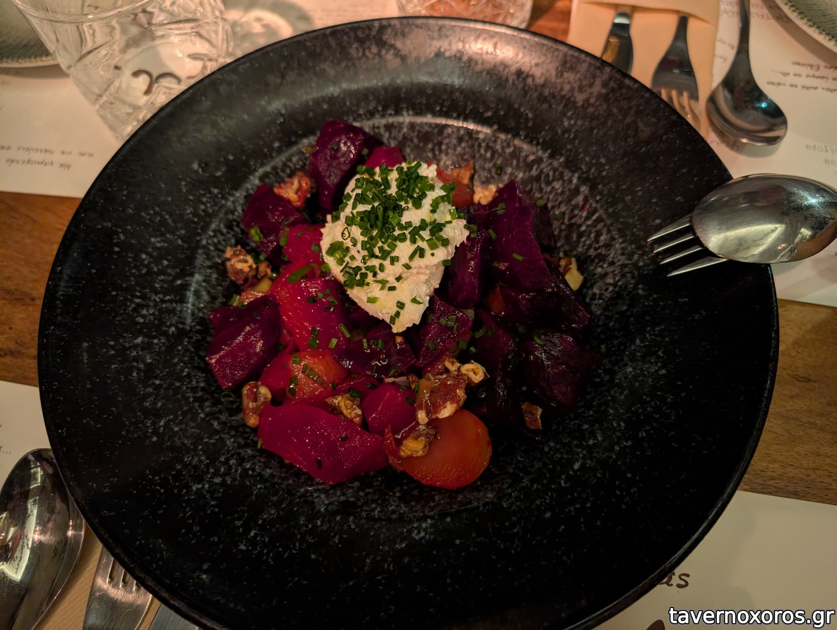 "Ψητά παντζάρια, καραμελωμένα καρύδια πεκάν και γαλομυζήθρα Κρήτης" (οκ)