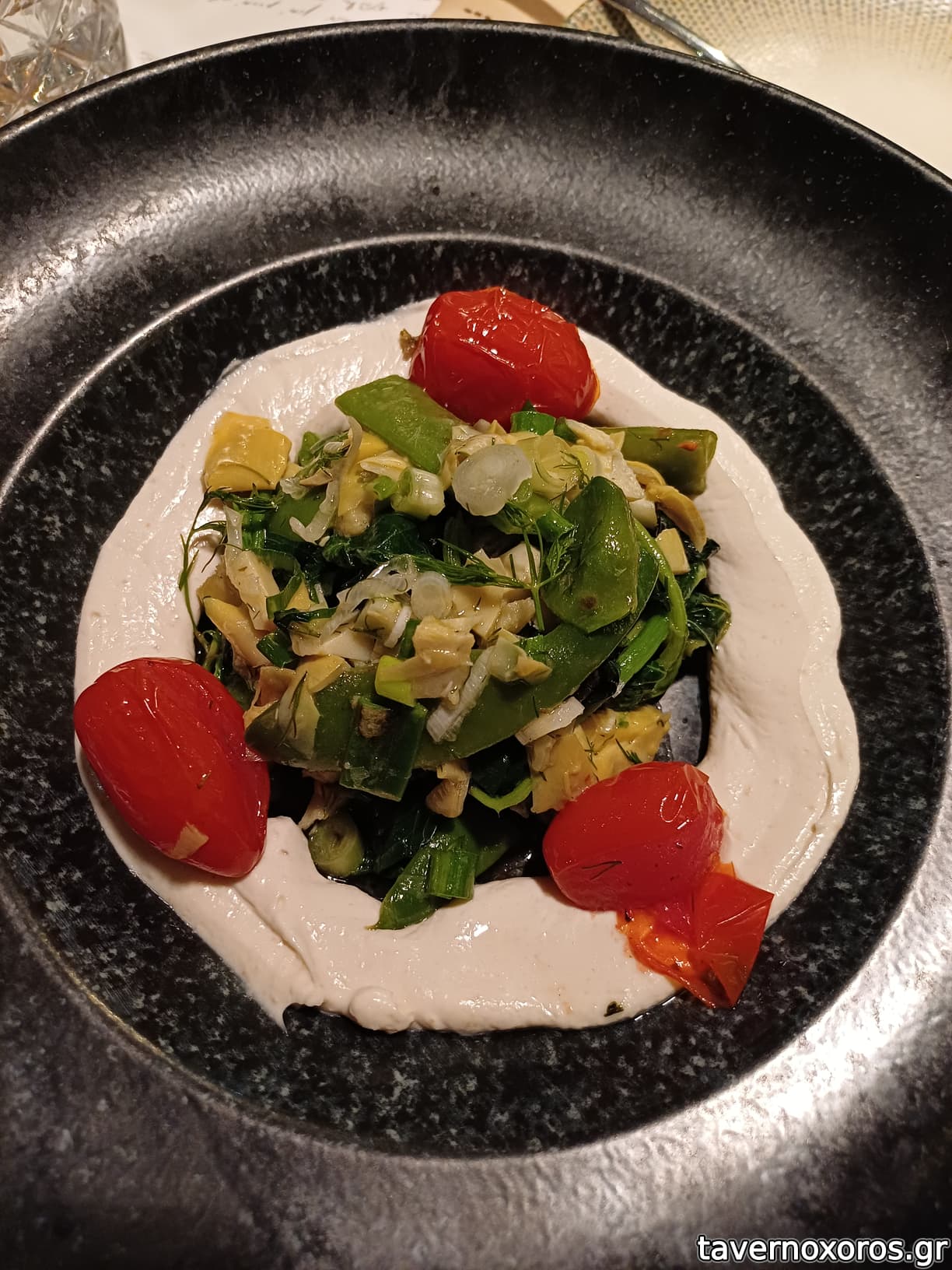 Καπνιστά χόρτα με φασολάκια και ταραμά (καλά)