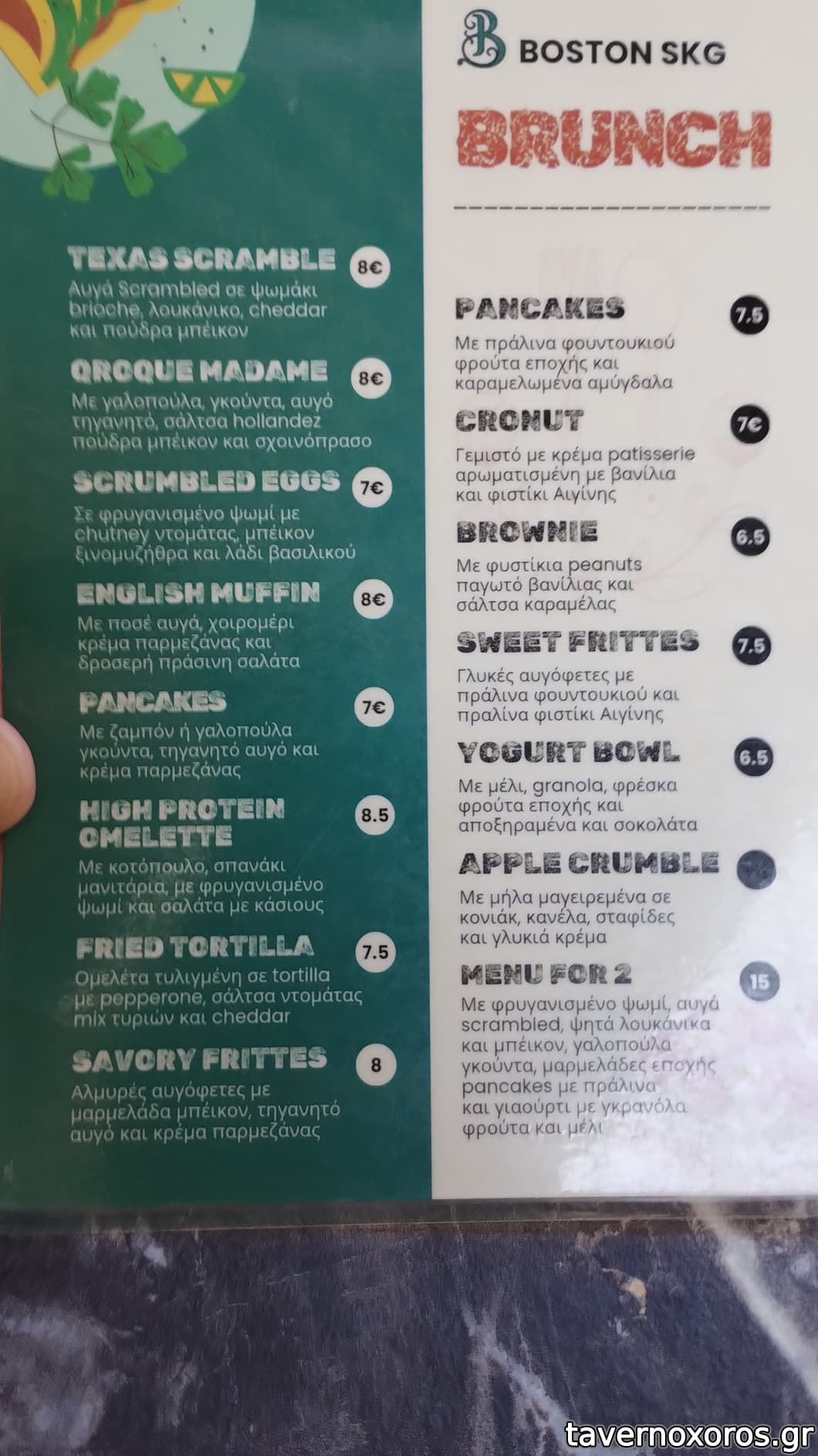 | Λέξεις κλειδιά | Μπόστον, #cafe-bar, #snacks, #brunch, #pinsa, #cocktails, #χυμοί, #αυγά, #ομελέτα, #bagels, #κρέπες, #προσούτο, #κοτόπουλο, #bowls, #σαλάτες, #burgers, #τοστ, #club sandwich, #bao bun, #ποικιλία τυριών, #ποικιλία αλλαντικών, #πλατώ τυριών, #λουκάνικο, #προφιτερόλ, #μιλφέιγ |