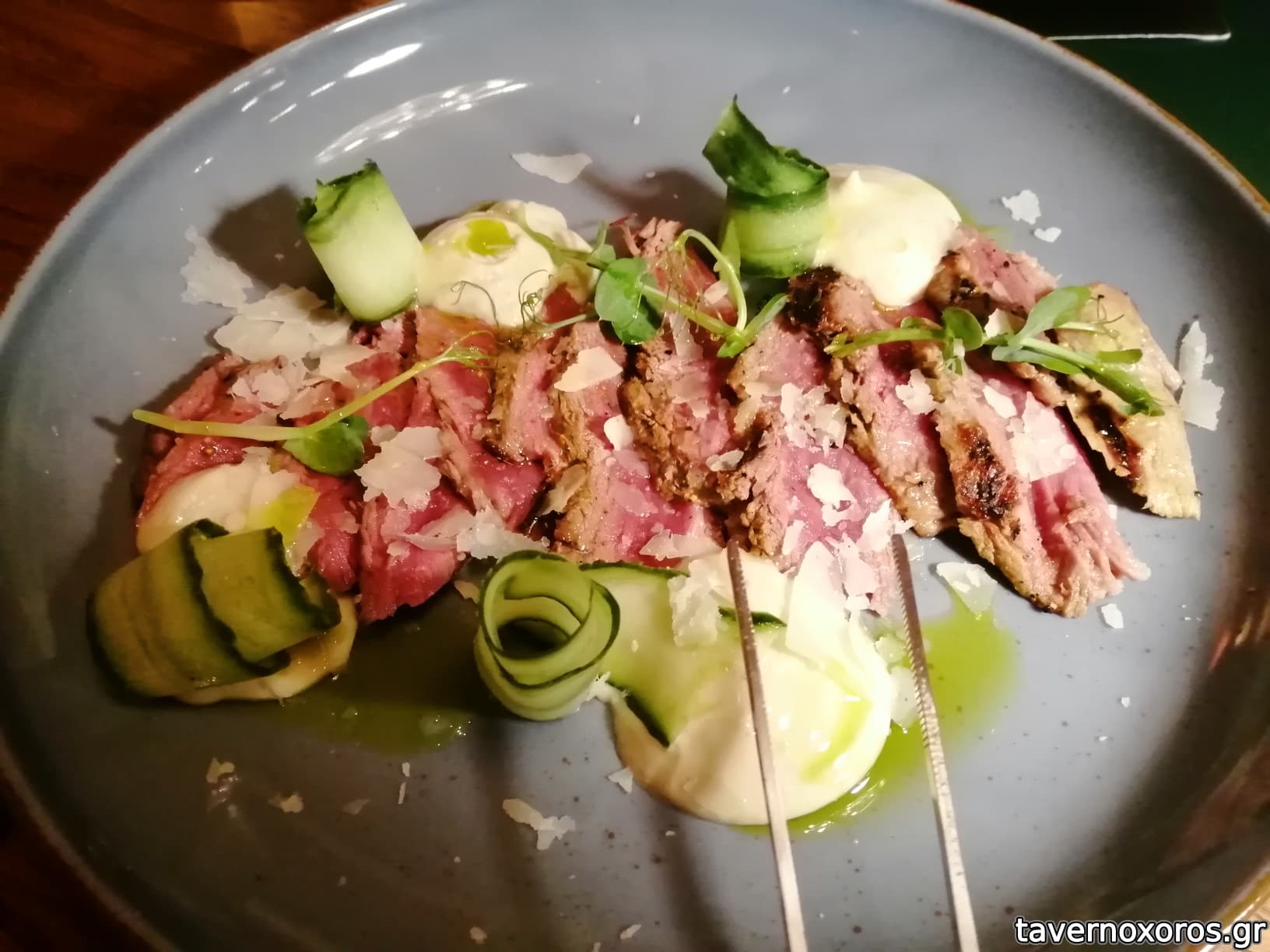 Carpaccio μοσχάρι με τρυφερά φυλλώματα και rezana Μετσόβου (18,5€, για μένα χοντροκομμένο, είχαμε ωστόσο προειδοποιηθεί)