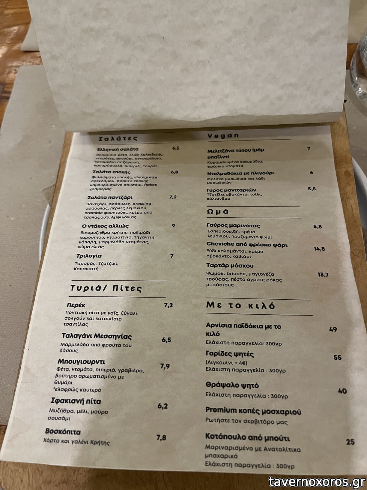 Τα ορεκτικά του είχαν αρκετό ενφιαφέρον, σαλάτα ντάκος αρκετά αδιάφορη αλλά τα κυρίως όλα πολύ γευστικά και οι συνδιασμοί διαφορετικοί αλλα πετυχημένοι. Συκώτι αρκετά σκληρό. Λίγο μικρές όμως οι μερίδες.