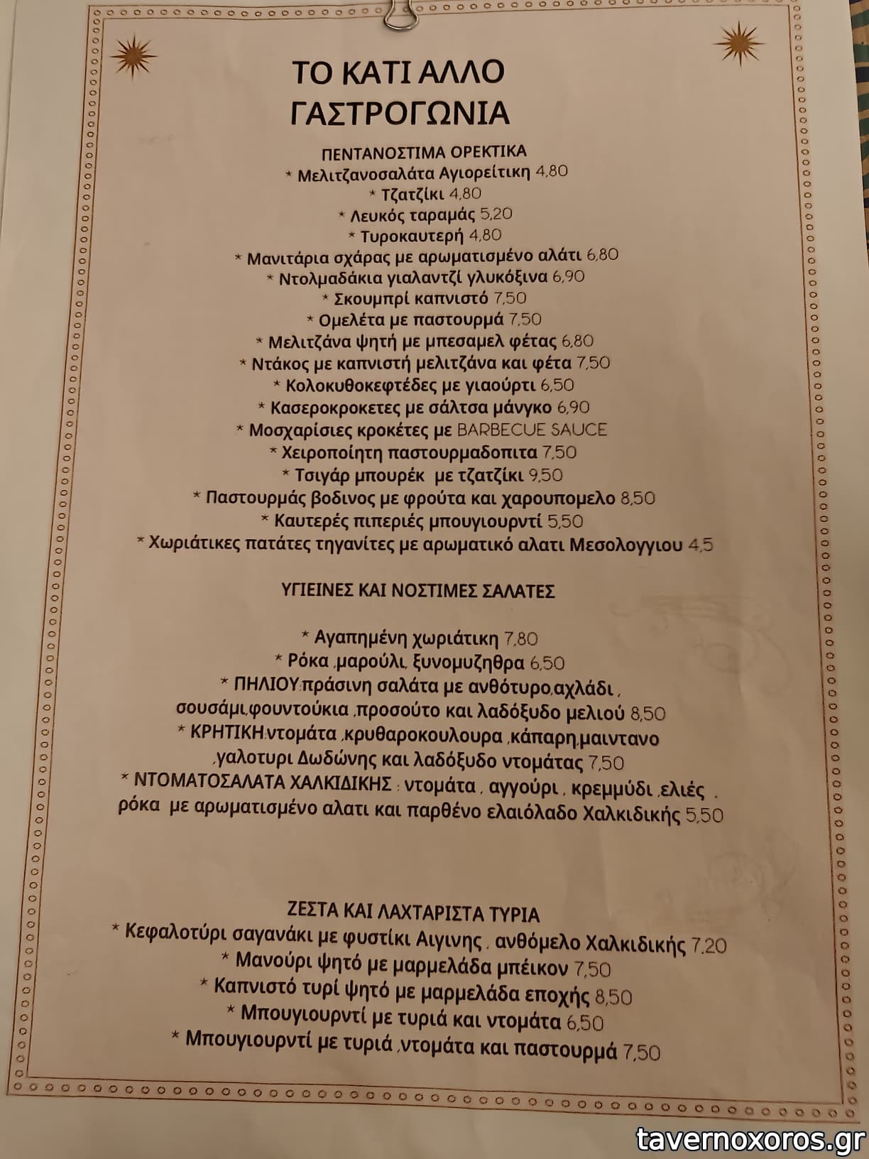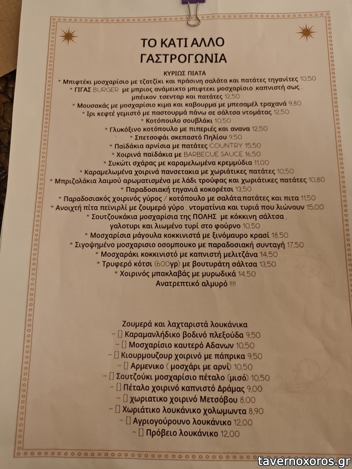 | Λέξεις κλειδιά | #ντάκος, #παστουρμαδόπιτα, #σουβλάκι, #μπιφτέκι, #ribs, #σουτζουκάκια σμυρνέικα, #κοκκινιστό, #σουτζούκι, #πανσετομπριζόλα, #ρεβύθια, #μανιτάρια, #φάβα, #ντολμαδάκια, #λουκάνικο, #μπιφτεκάκια, #πανσέτα, #μουσακάς, #ομελέτα, #παστουρμάς, #καβουρμάς, #σύγλινο, #κολοκυθοκεφτέδες, #γλώσσα μοσχαρίσια, #σπεντζοφάι, #κοτόπουλο, #παϊδάκια, #συκώτι, #χοιρινή, #τηγανιά, #γύρος, #στριφτάρια, #πρόβειο, #μάγουλα, #σουτζουκάκια, #οσομπούκο, #κότσι, #μοσχαρίσια μάγουλα, #αρνάκι ψητό, #ζυμαρικά, #μιλφέιγ |