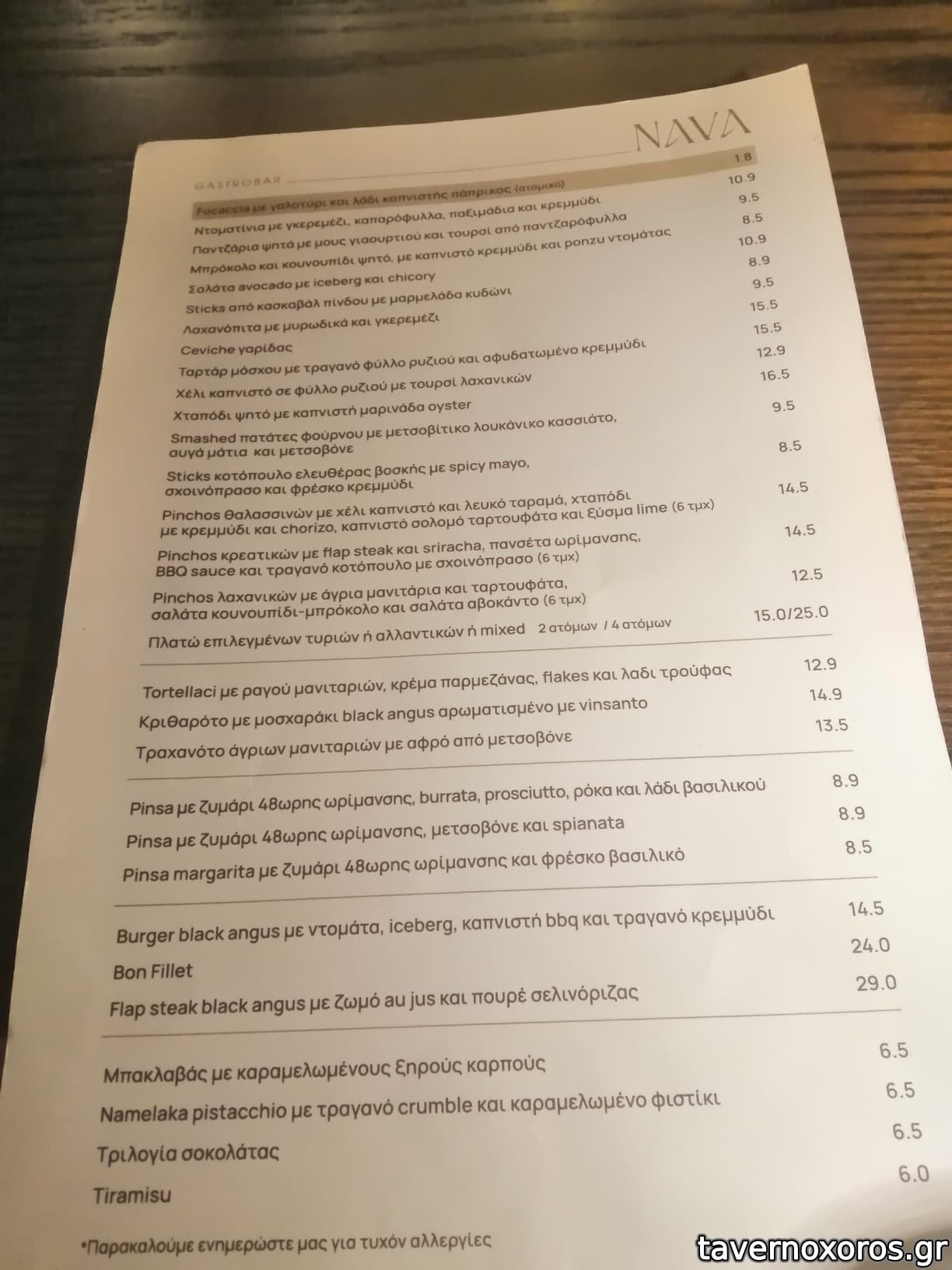 | Λέξεις κλειδιά | Νάβα, #cafe-bar, #cocktails, #πεζόδρομος, #πλατώ τυριών, #γκερεμέζι, #steaks, #γαλοτύρι, #λουκάνικο, #λαχανόπιτα, #κασκαβάλι, #χέλι καπνιστό, #χταπόδι, #κοτόπουλο, #ποικιλία τυριών, #ποικιλία αλλαντικών, #μπιφτέκι, #arancini, #pinsa, #αρνάκι, #σολομός, #γαρίδες, #wagyu, #burgers, #μπακλαβάς, #τιραμισού |