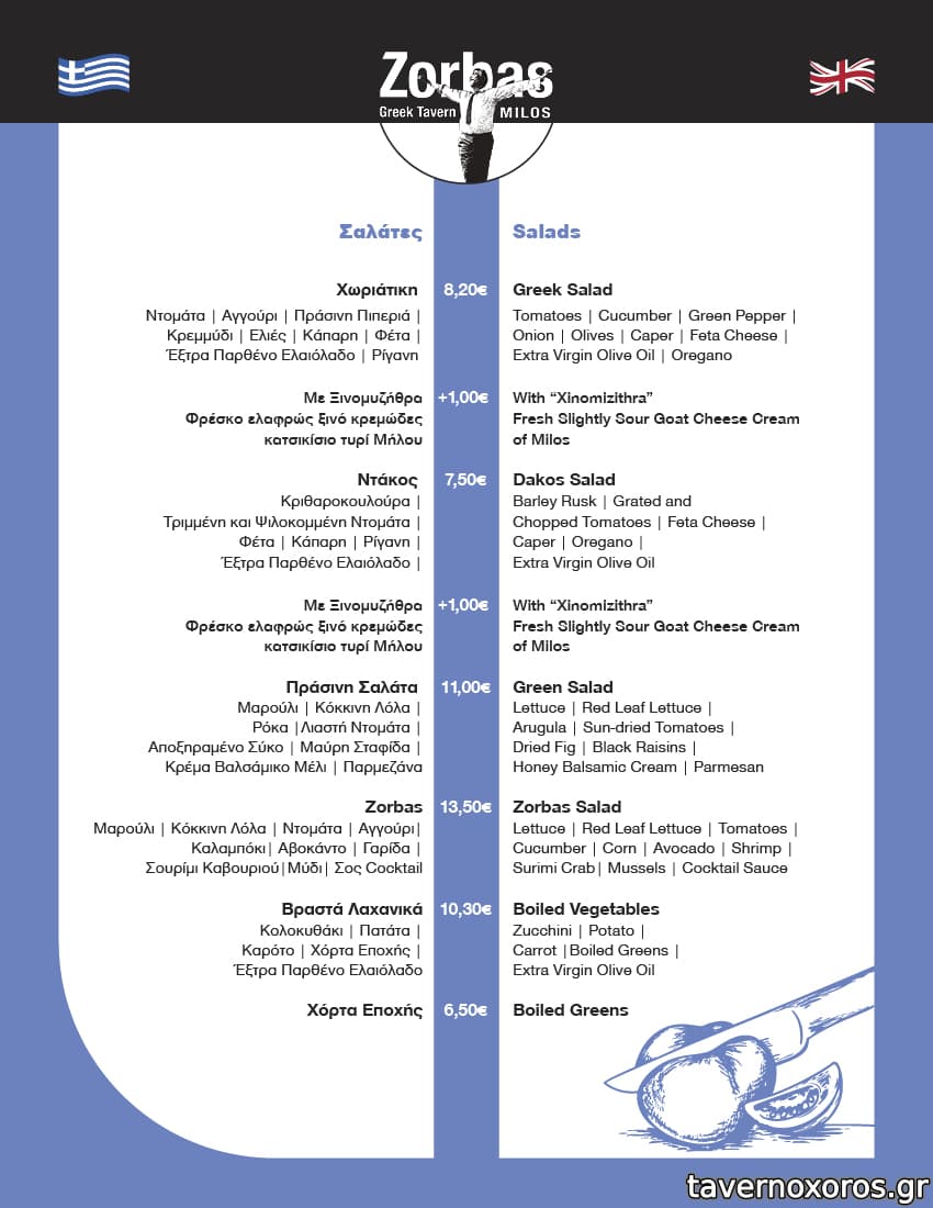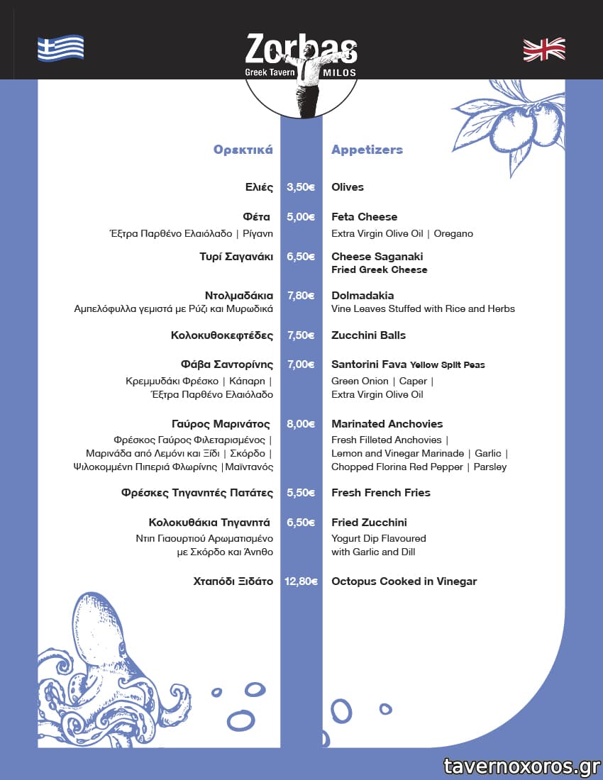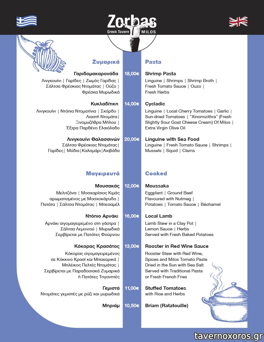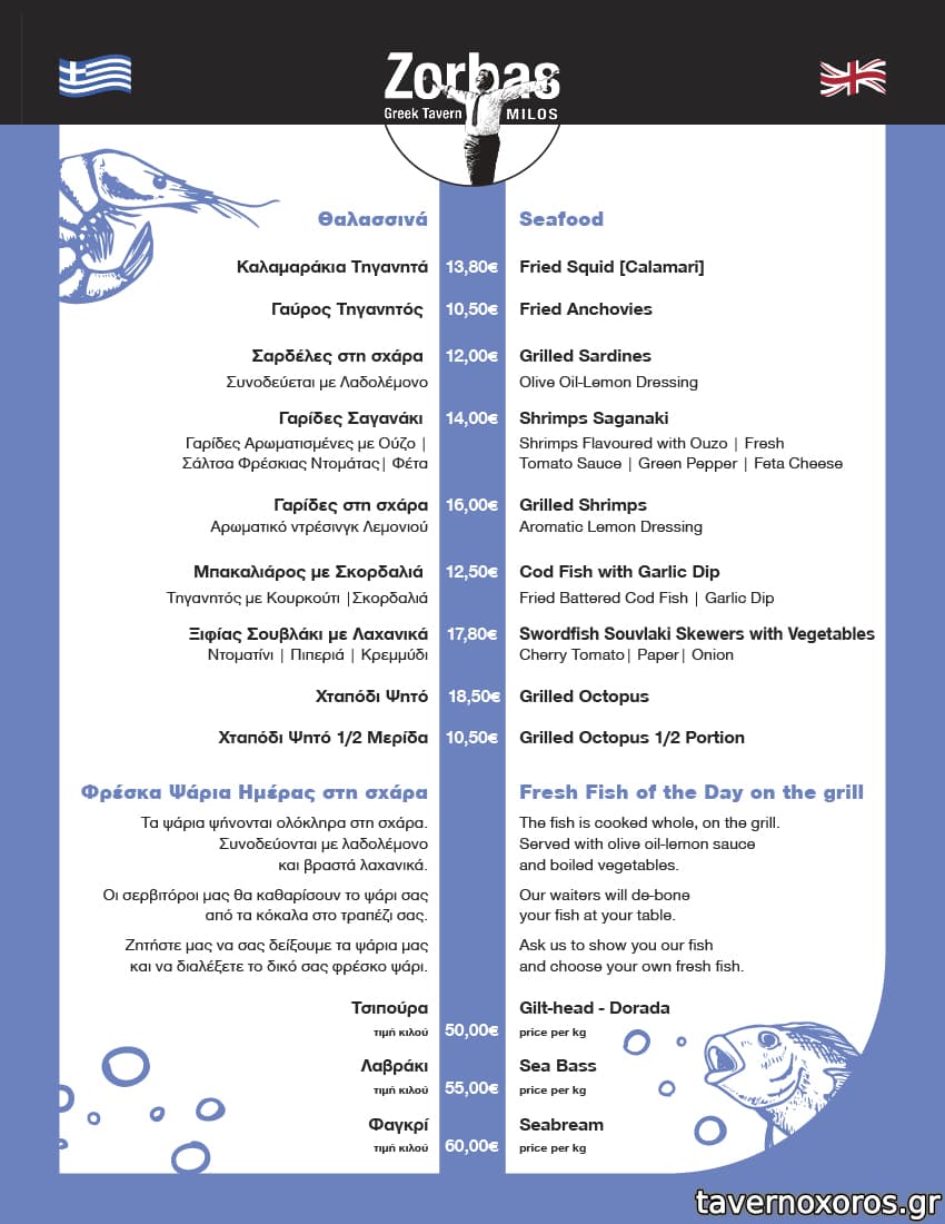 | Λέξεις κλειδιά | Ζορμπάς, #seaside, #κολοκυθοκεφτέδες, #ξινομυζήθρα, #ντολμαδάκια, #φάβα, #γαύρος μαρινάτος, #χταπόδι, #γαρίδες, #σαρδέλα, #γαύρος, #μπακαλιάρος σκορδαλιά, #σκοτύρι, #κολοκυθάκια, #σχιζάκια, #πιταράκια, #ομελέτα, #μανούρα, #σκορδολάζανα, #μουσακάς, #γεμιστά, #κόκορας κρασάτος, #αρνάκι γάστρα, #αρνάκι στο φούρνο, #χοιρινή, #μοσχαρίσια μπριζόλα, #κοντοσούβλι, #πανσέτα, #μπιφτέκι, #λουκάνικο, #πορτοκαλόπιτα, #κουφέτο |