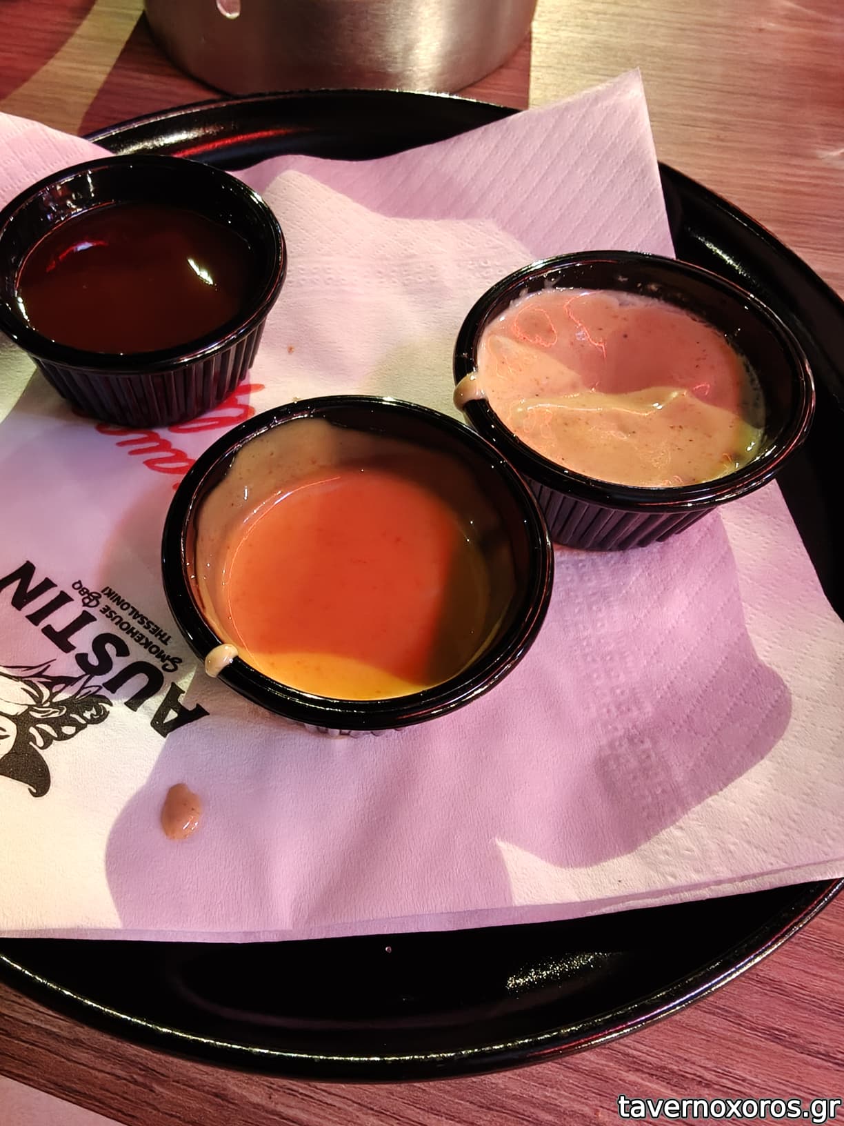 Αριστερά BBQ sauce (nothing special imo. Από ένα κατάστημα με ειδίκευση στο κρέας θα περίμενα κάτι πιο εκλεκτό για τη συγκεκριμένη sauce, κάτι σε δική τους μυστική συνταγή) Κάτω Sriracha Mayo (καλή με ωραία σπιρτάδα) Δεξιά Burger sauce (αρκετά φλατ)