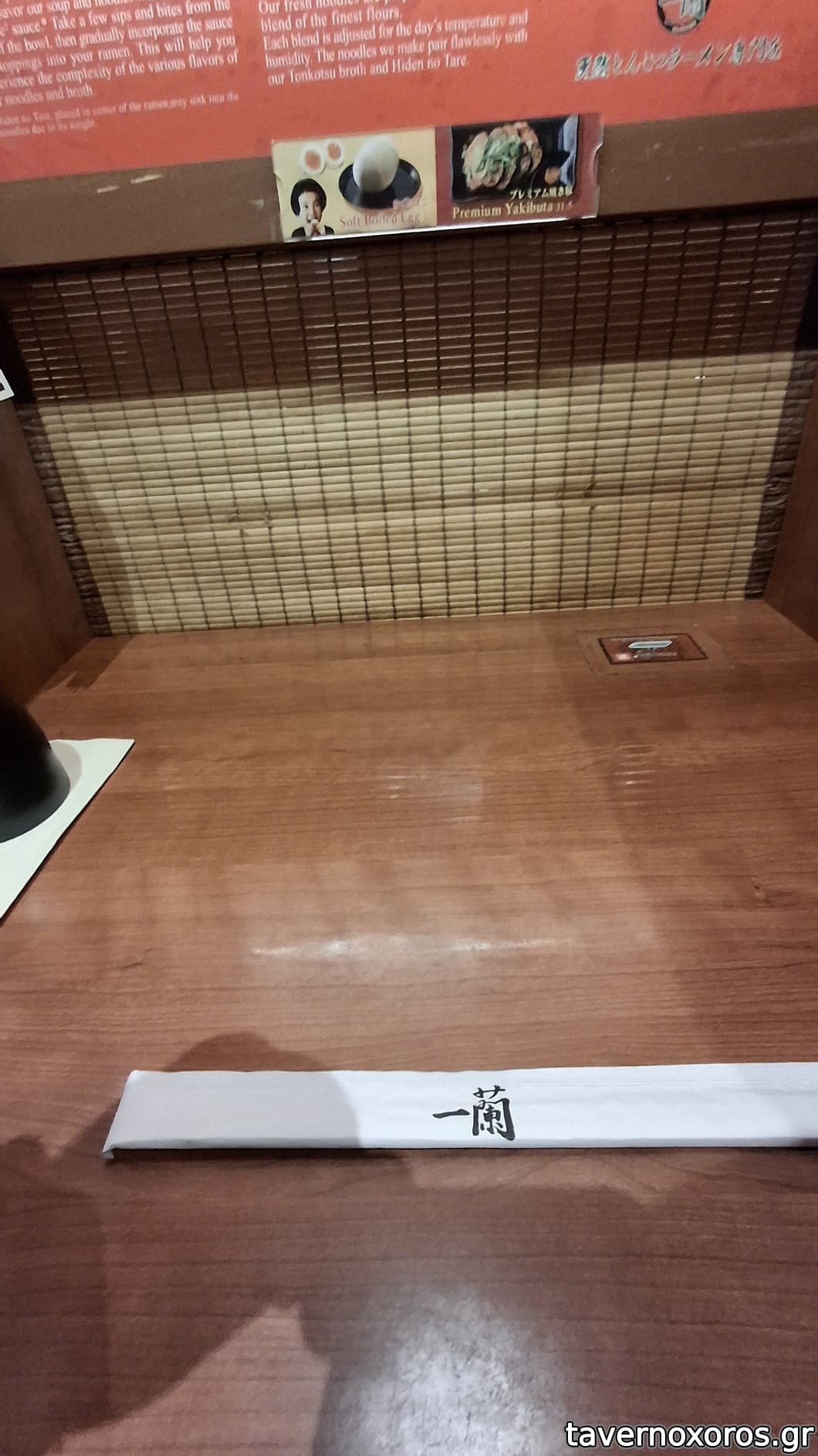 Πήγαμε κατά τύχη, χωρίς να γνωρίζουμε το concept. Σερβίρουν μόνο ένα ramen, γιατί αυτό ξέρουν να κάνουν τέλεια όπως λένε. Με το που μπαίνεις παραγγέλνεις σε μια οθόνη, όπου ουσιαστικά επιλέγεις λεπτομέρειες για το ράμεν που φτιάχνουν (πόσο διάφανα θα είναι τα noodles, πόσο καυτερό θα είναι, αν θες φρέσκο κρεμμύδι κλπ). Μετά περιμένεις να αδειάσει booth και όταν αδειάσει σε φωνάζουν να καθίσεις. Ο καθένας κάθεται μόνος του, οπότε εμείς που ήμασταν παρέα κάτσαμε στη σειρά σε τρία booth. Μετά ανοίγει ένα πορτάκι, δίνεις την παραγγελία και σε σερβίρουν. Έχει και κάποιες επιλογές για έξτρα noodles, για γλυκό ή συμπληρώματα αφού καθίσεις. Στο δια ταύτα, το φαγητό ήταν πάρα πολύ καλό και η εμπειρία ιδιαίτερη.