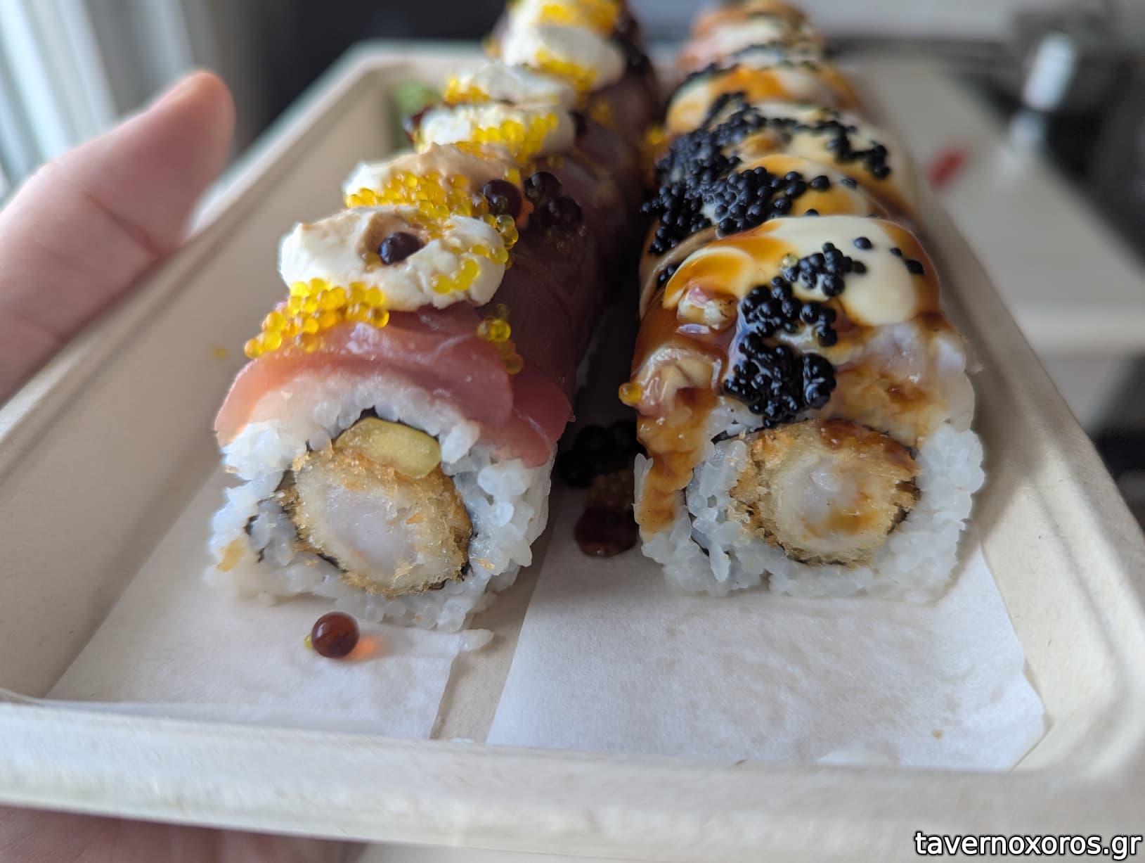 Τηγανητή tempura γαρίδα στα μισά σούσι που αλλοιώνει τη γεύση.