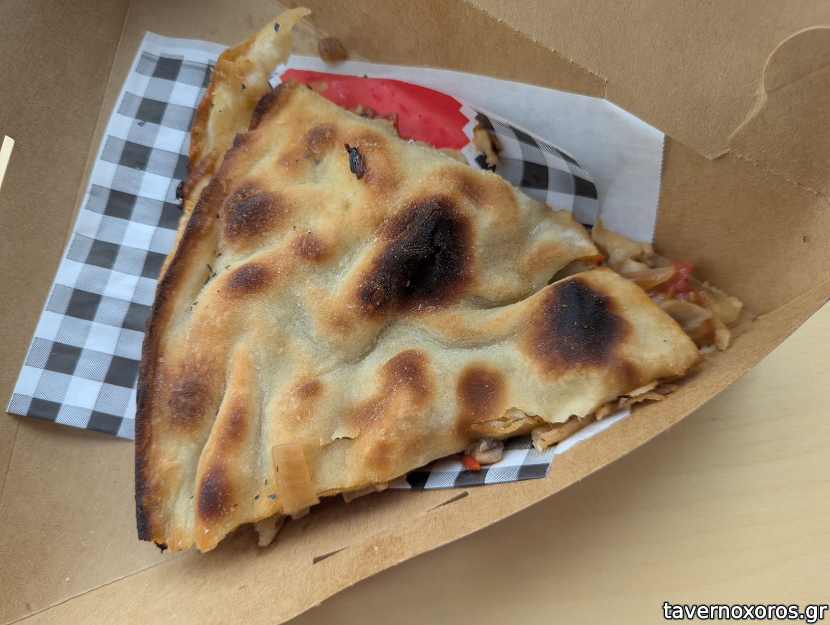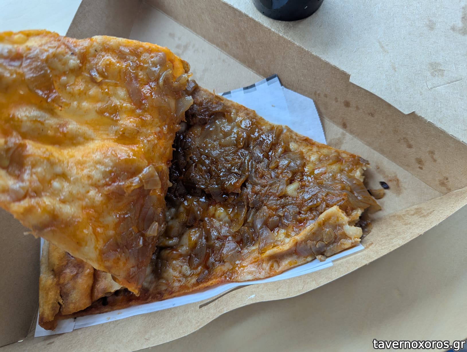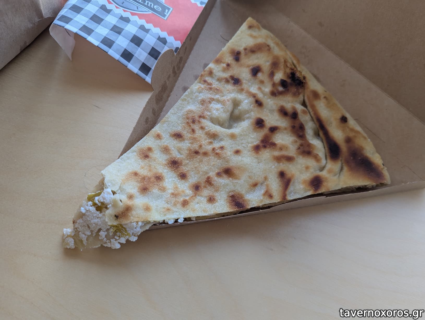 Πήρα μια κρεμμυδόπιτα. Το φύλλο είναι περισσότερο ζύμη και λιγότερο φύλλο, έχει πιο ψωμένια αίσθηση και ειδικά οι γωνίες είναι πολύ καλές. Έτσι που είχε και σάλτσα ντομάτας, γλυκά κρεμμύδια και τριγωνικό σχήμα έφερνε περισσότερο σε πίτσα η γεύση. Την βρήκα ευχάριστη.