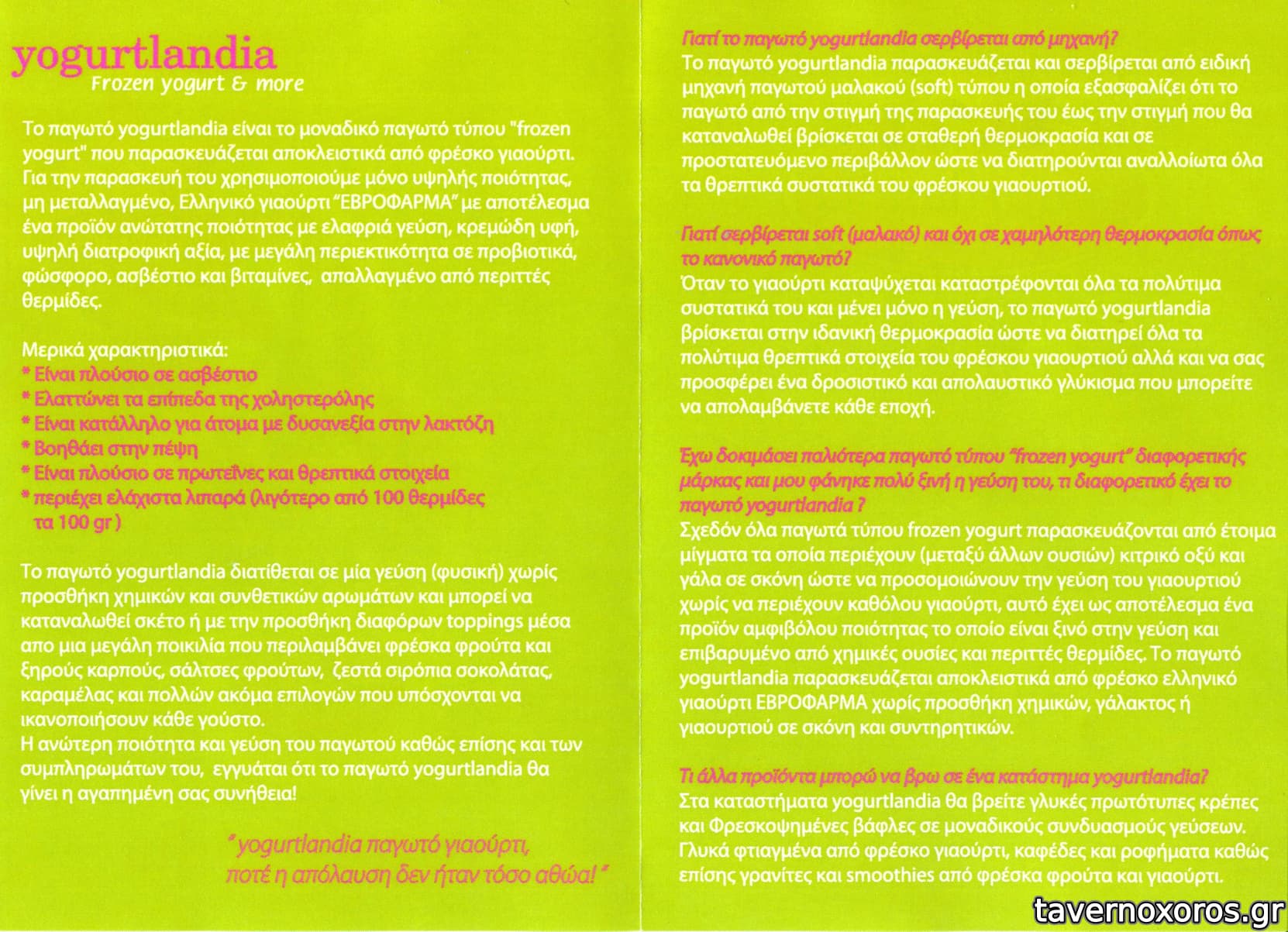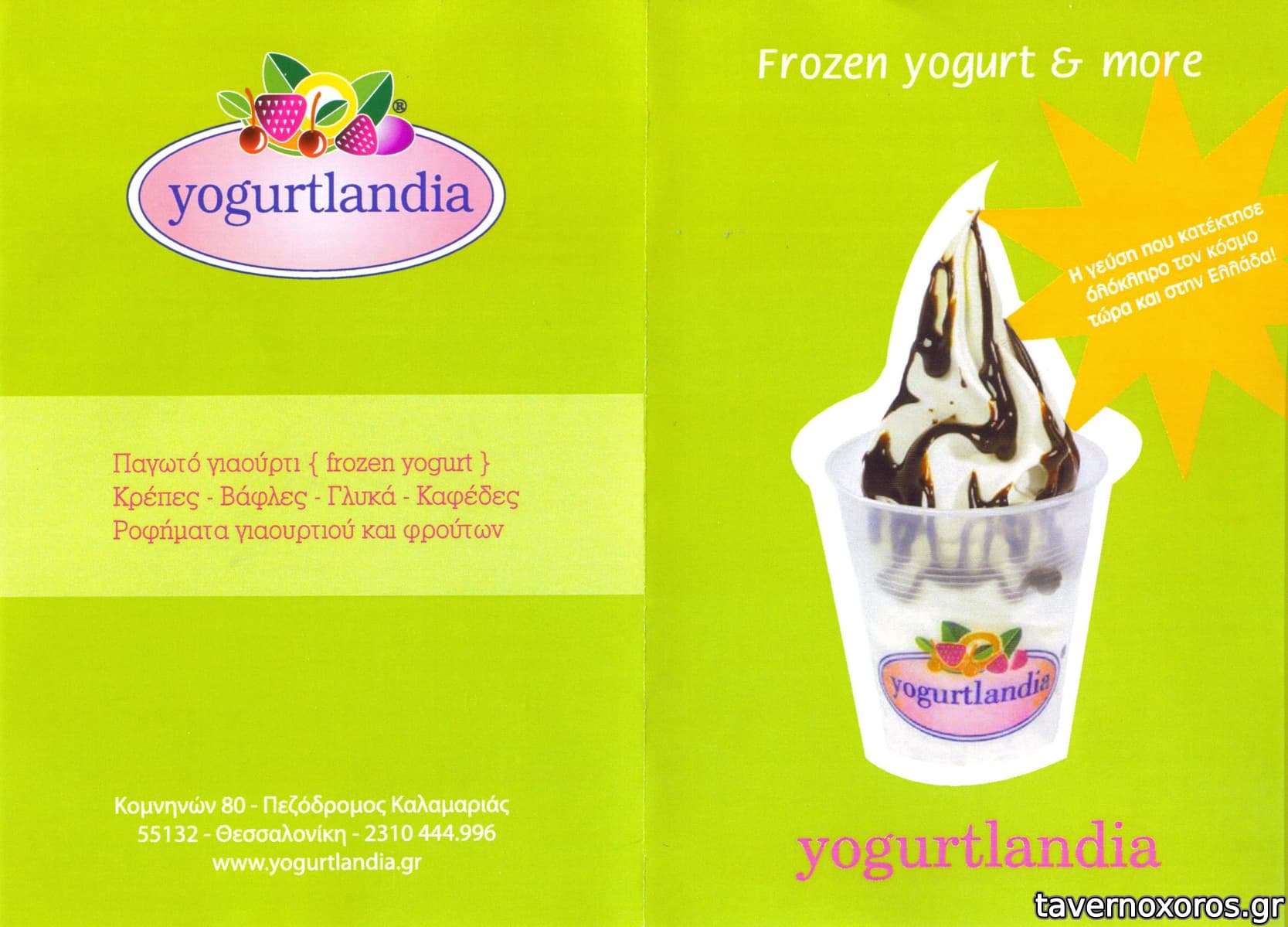 Περασα σημερα απο το πεζοδρομο και σταματησα να δοκιμασω αυτο το παγωτο γιαουρτι που ολοι λενε... προσωπικη γνωμη: πολυ καλο προιον, με πολυ λιγα λιπαρα απ'οτι καταλαβα(σε σχεση με τα αλλα παγωτα). Πολλες επιλογες να διαλεξετε(αυτα που λενε " toppings & σάλτσες") και αρκετα χαμηλες τιμες. Στα θετικα το ευχαριστο μαγαζι και η αποδειξη για αξιας 2ε παγωτο.