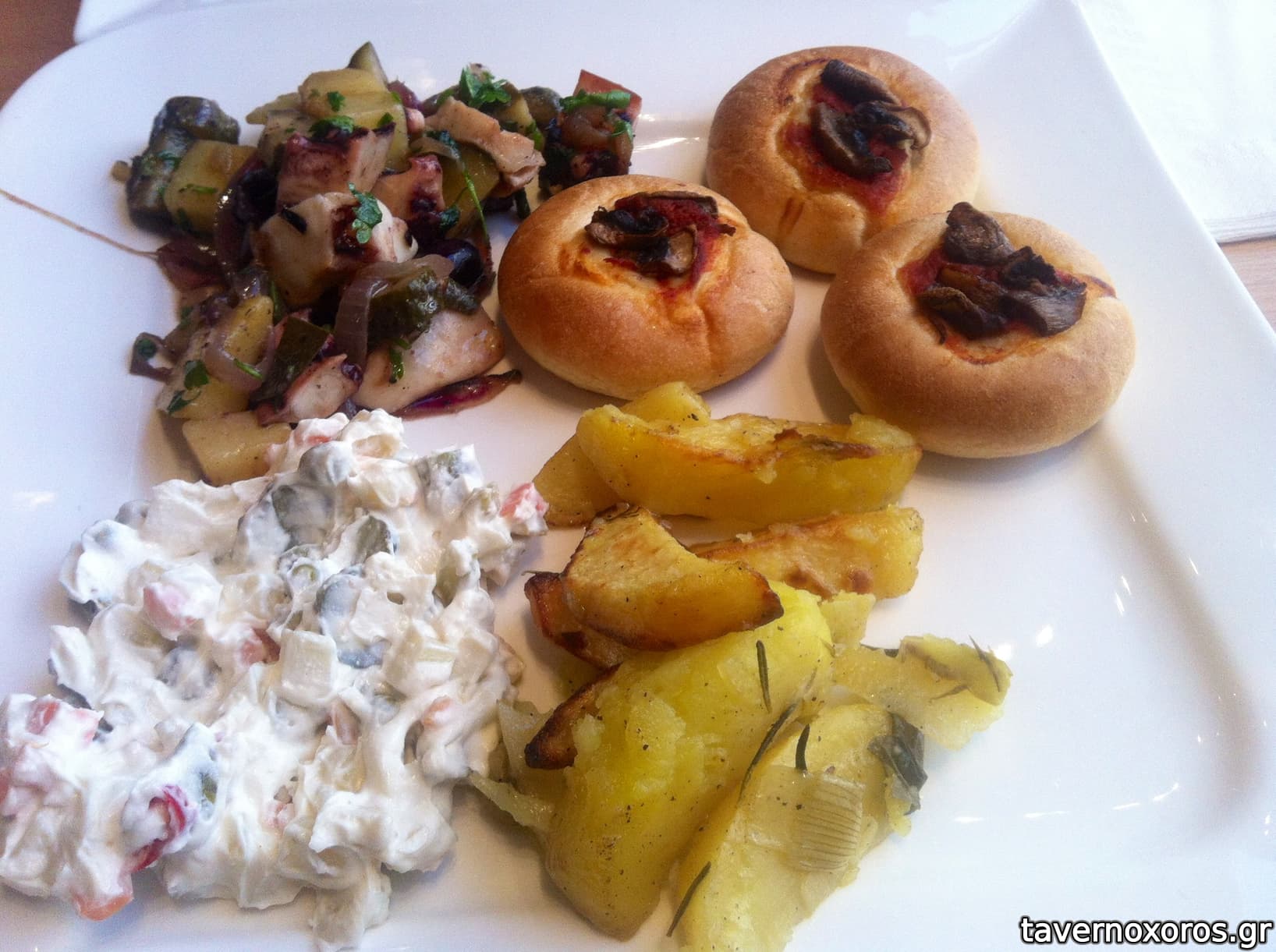 Πιτσάκια με μανιτάρια (καλά), Σαλάτα χταπόδι (ΟΚ), "Ρωσική" με ταραμά (καλή)