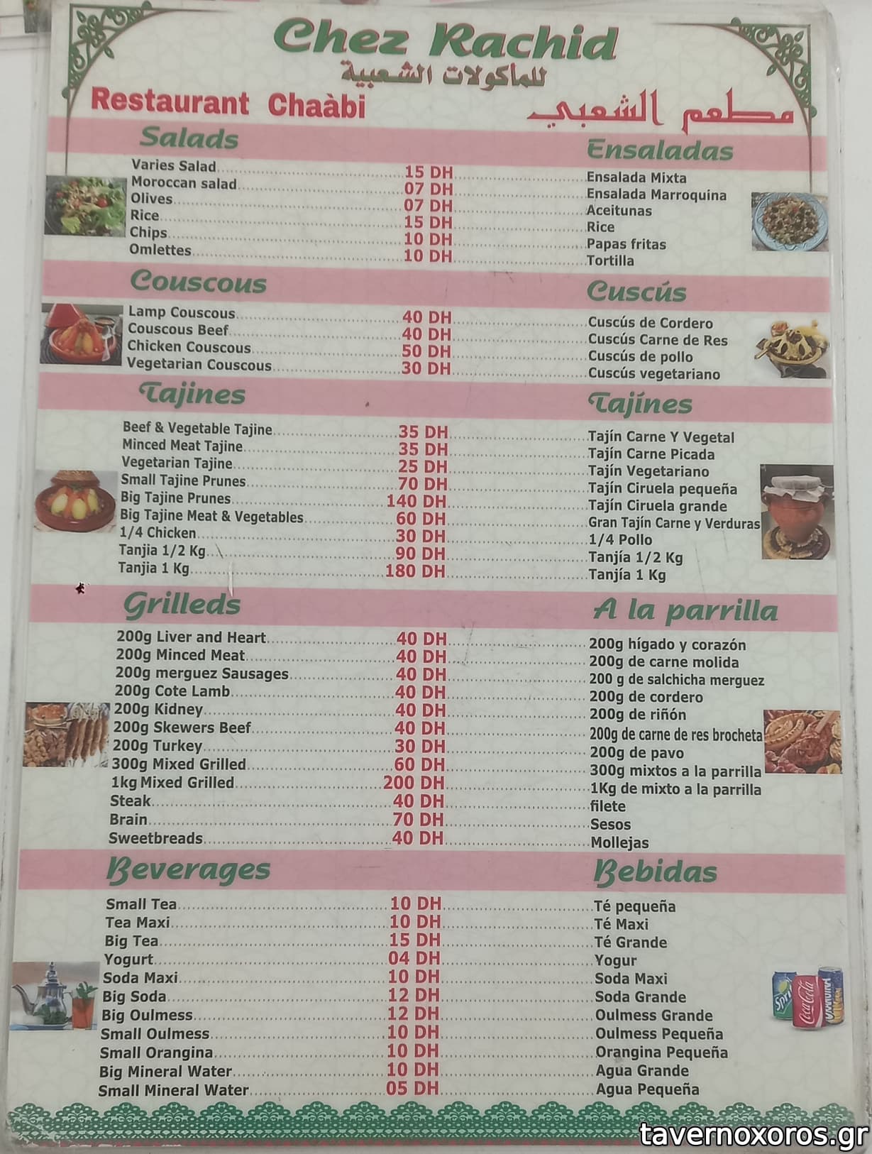Στα του φαγητού, δοκιμάστηκε σαλάτα ντομάτα, λουκάνικα, κουσκούς με κοτόπουλο και tajine με μοσχάρι και λαχανικά, όλα άνω του μετρίου και σε εξαιρετικές τιμές (5€ η μερίδα)