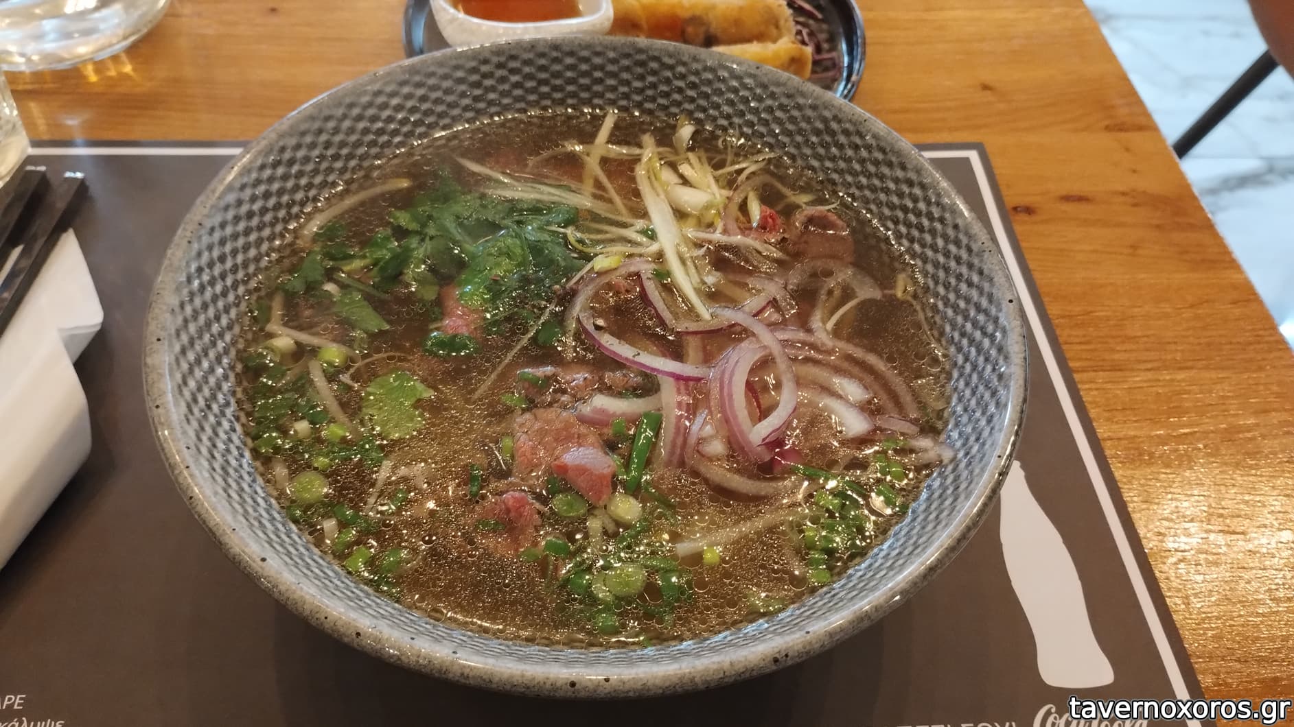 Καλός ο χώρος του μαγαζιού. Σέρβις οκ, λίγο το έψαχνα. Μού έφεραν σύντομα τα spring rolls και μετά από λίγο τη σούπα. Τα συνοδευτικά άργησαν και όταν τα ζήτησα, είπαν ναι-ναι και τα έφεραν (βασικά ζήτησα sriracha). Τελικά έπρεπε να φέρουν και hoisin sauce- την έβγαλα με τη fish sauce και λίγο καυτερό από τα συνοδευτικά (για dip του βοδινού).