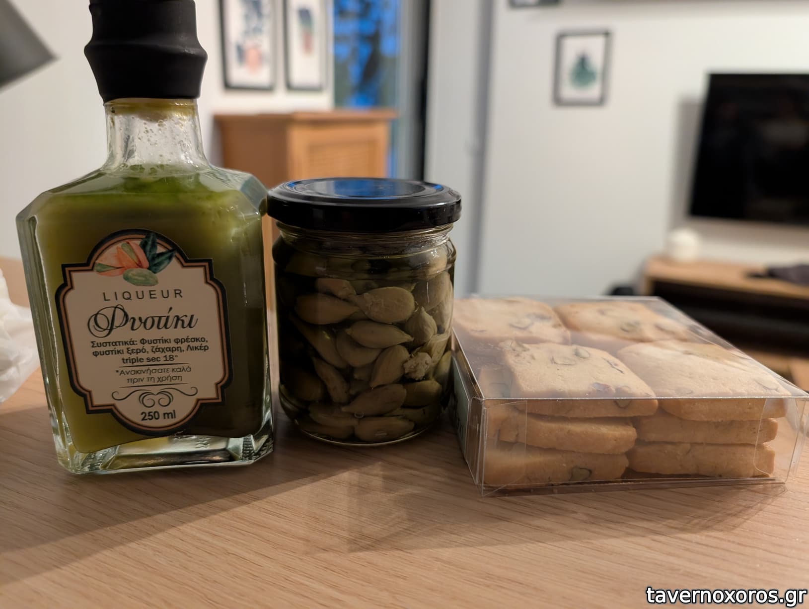 Λικέρ φυστίκι (ok) & φυστίκι τουρσί (χωρίς νόημα) & μπισκότα βουτύρου με φυστίκι (νόστιμα, αλλά χωρίς να νιώθεις το φυστίκι)