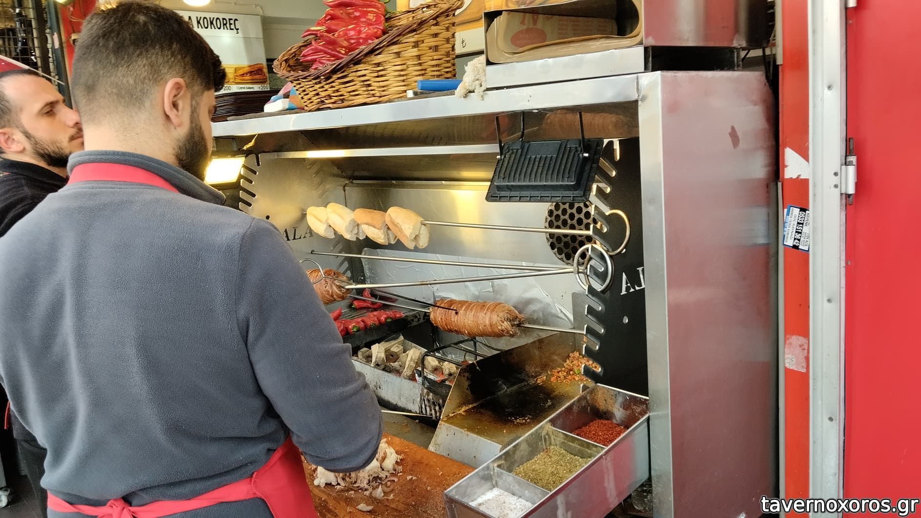 Μικρό μαγαζάκι με τις σούβλες και τα κοκορέτσια σε πρώτο πλάνο.