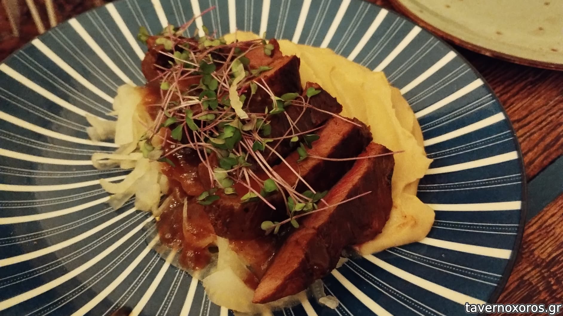 Μοσχαρίσια short ribs πάνω σε κρεμμύδι πίκλα και έναν πουρέ που δε θυμάμαι (ίσως kohlrabi. Πολύ καλό)