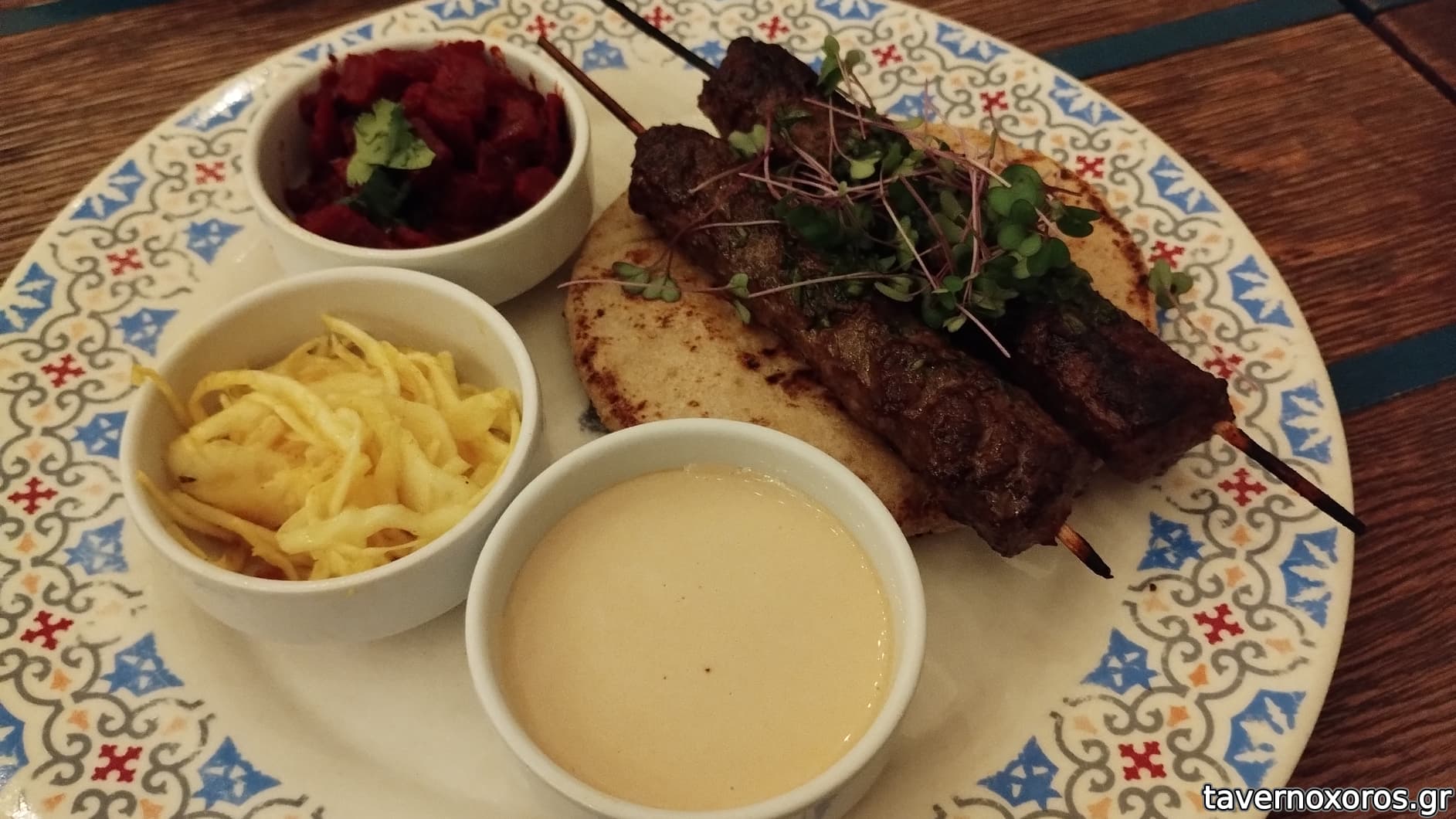 Μοσχαρίσια κεμπάπ με ίδια γαρνιτούρα με το κοτόπουλο (ωραία τα κεμπάπ. Είχαν μια ευχάριστη μυρωδιά κρεάτινη μαζί με τα μπαχαρικά τους)